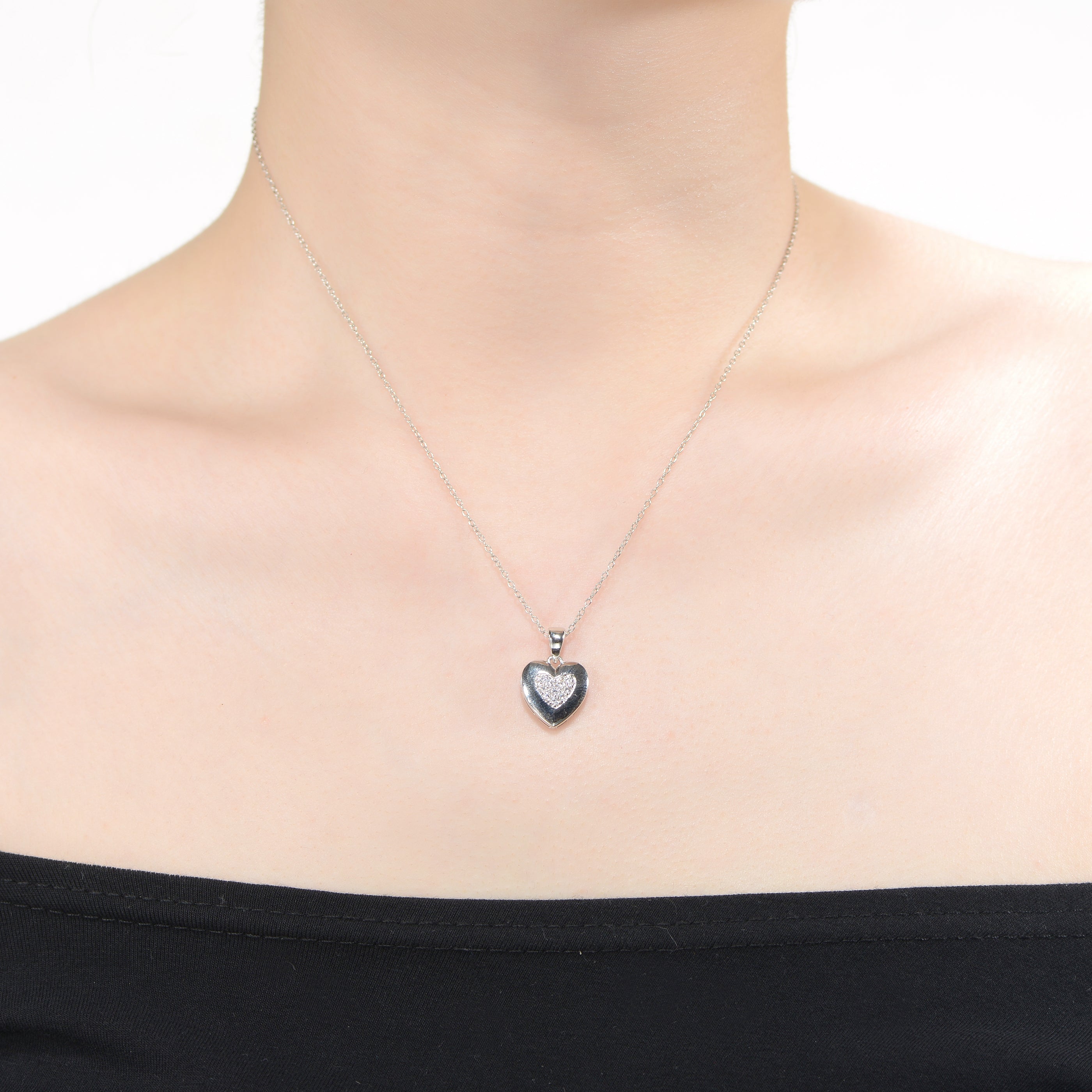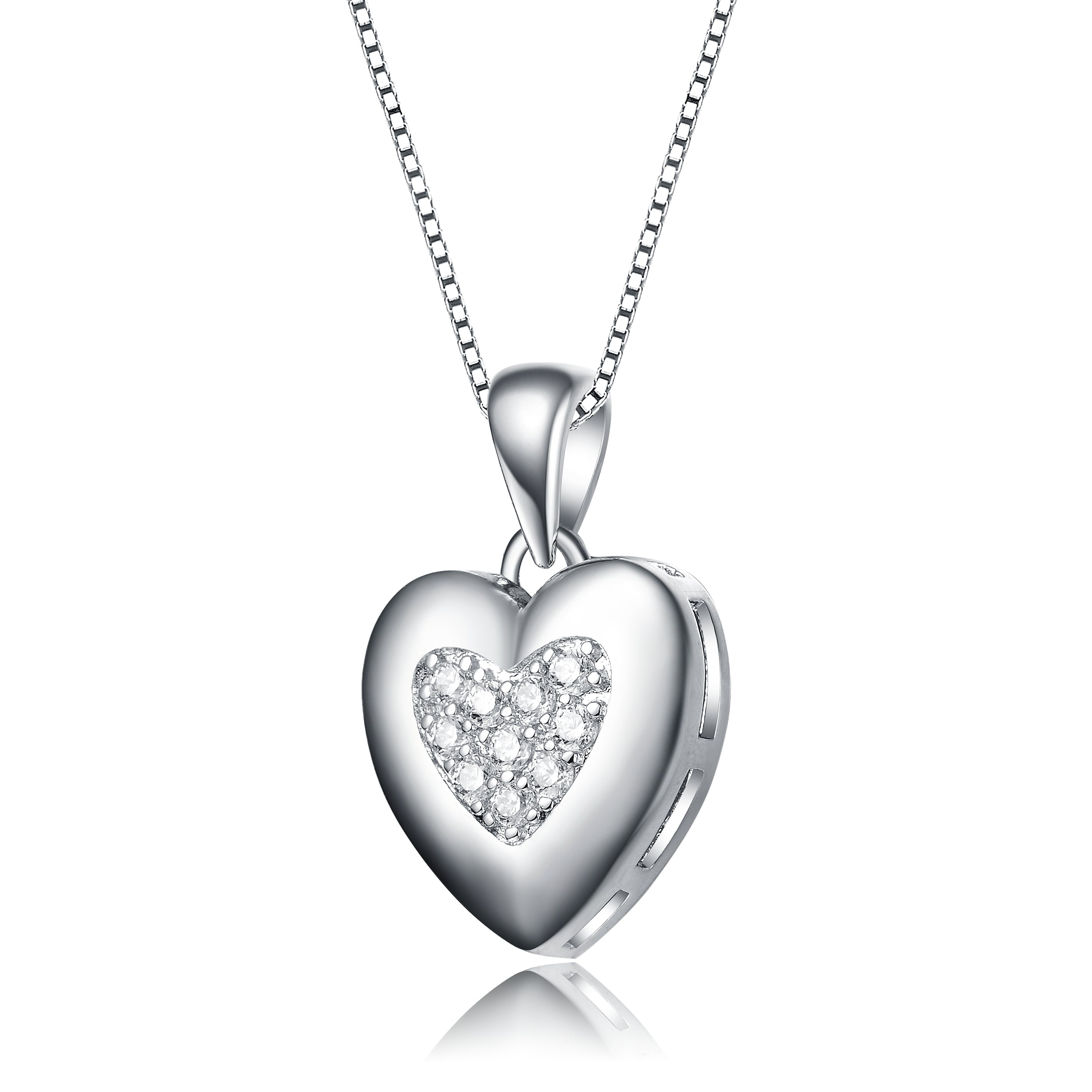 White Gold Plated with Cubic Zirconia French Pave Heart Pendant Necklace. Make romance last with a touch of chic style! This brightly polished white gold plated necklace features sparkling round brilliant cut cubic zirconia pave set in the middle of an ultra-shiny heart frame. A tapered bail with a sturdy box chain threaded through makes this drop heart pendant ready for wear. A lobster clasp keeps it secure. Gift this enchanting heart to your beloved on any holiday.