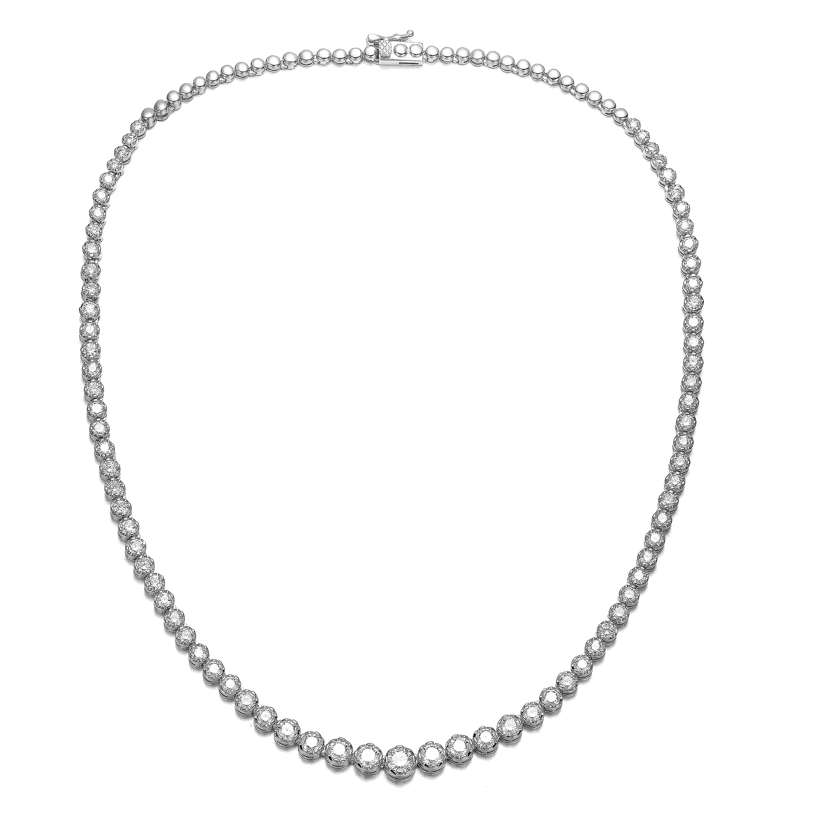 White Gold Plated with Cubic Zirconia Graduated-Size Tennis Chain Anniversary Necklace. Make romantic memories last every day by gifting this elegant white gold plated graduated-link tennis chain necklace to your beloved. Sparkling round brilliant cut diamond-like cubic zirconias set in round links gives this pretty tennis chain elevated modern glamor. A hidden box clasp and safety latch keeps this flat necklace secure when worn, allowing it to sit gracefully on the collarbone. Necklace measures 17" long.