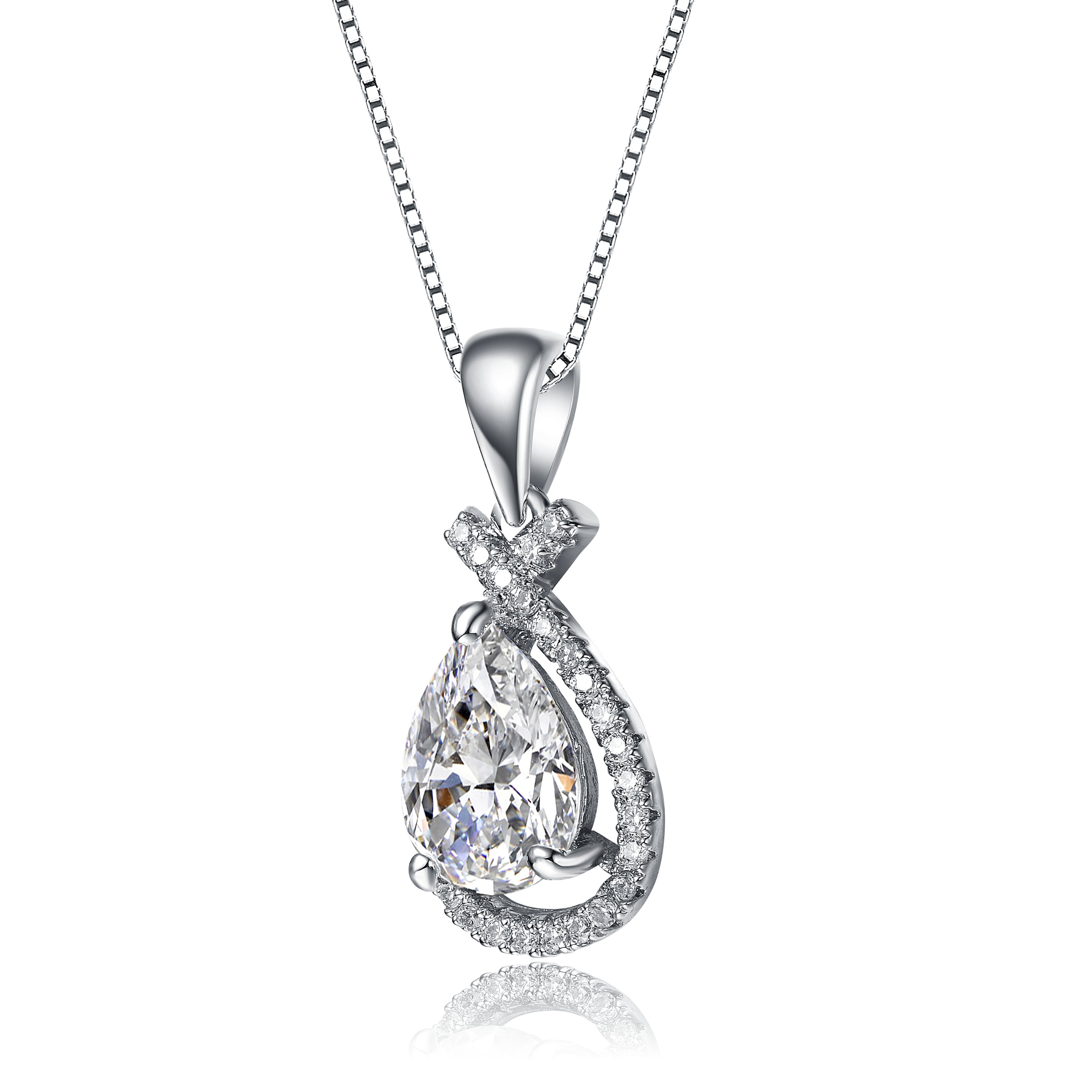 White Gold Plated with Cubic Zirconia Pear Rain Droplet Infinity Love Knot Pendant Necklace. This stunning white gold plated drop pendant necklace features a glittering pear-shaped cubic zirconia solitaire secured in a three-prong setting. Round brilliant cut cubic zirconias pave set in a swirling infinity love knot halo add romance to this enchanting design. A shiny box chain threaded through the top of the tapered bail finishes the look, all secured with a lobster clasp.