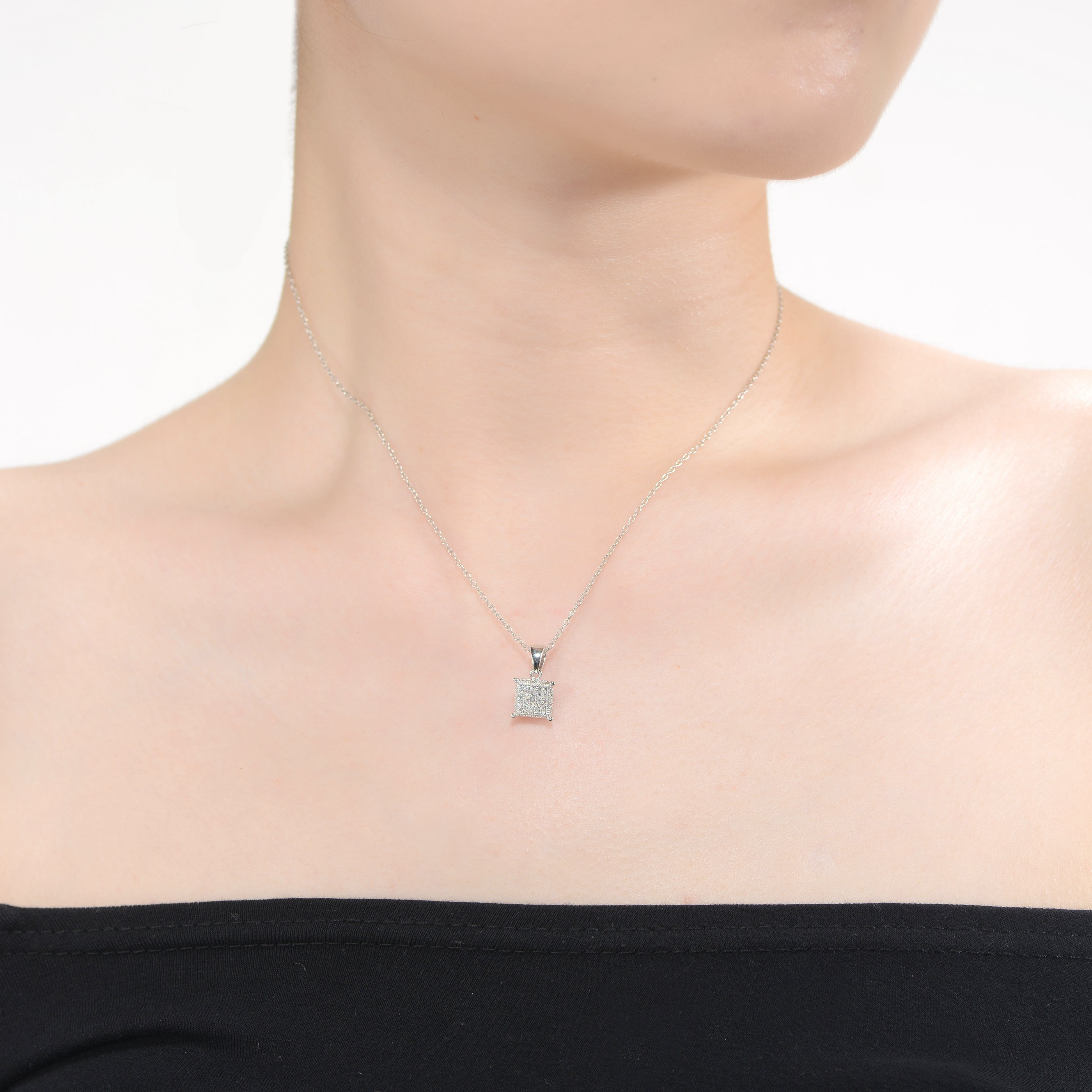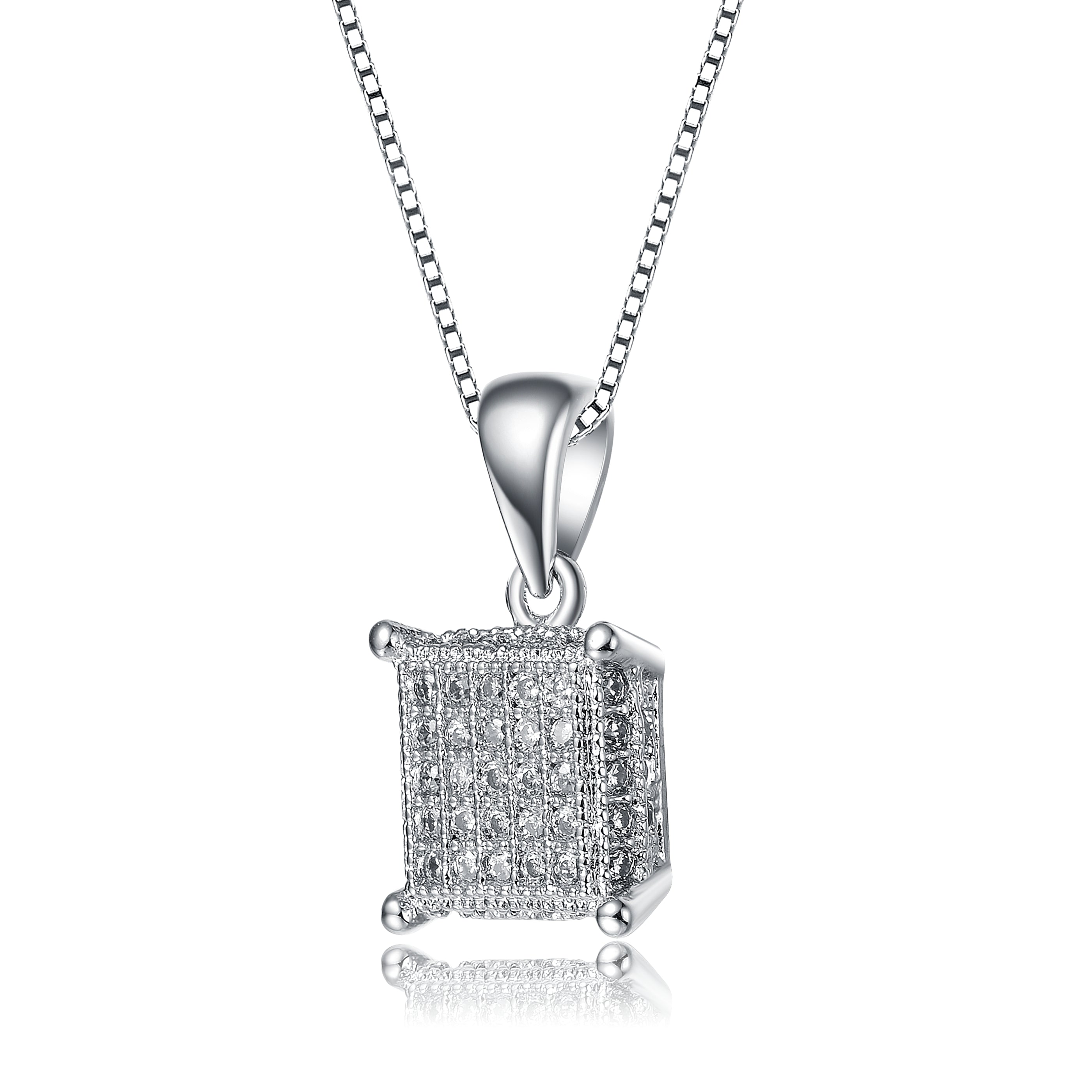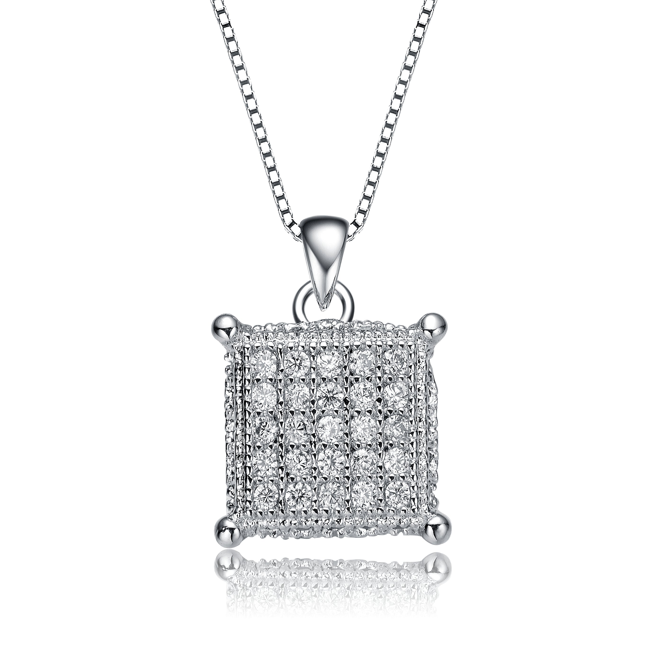 White Gold Plated with Cubic Zirconia Square Pave Pendant Necklace. This gorgeous white gold plated pendant necklace showcases round brilliant cut cubic zirconia French pave set in a square pendant, adding a vintage influence to this striking geometric design. A shiny tapered bail with a durable cable chain threaded through makes this dazzling pendant ready for wear, finished with a secure lobster clasp. Layer this pendant with other necklaces, or wear it solo.