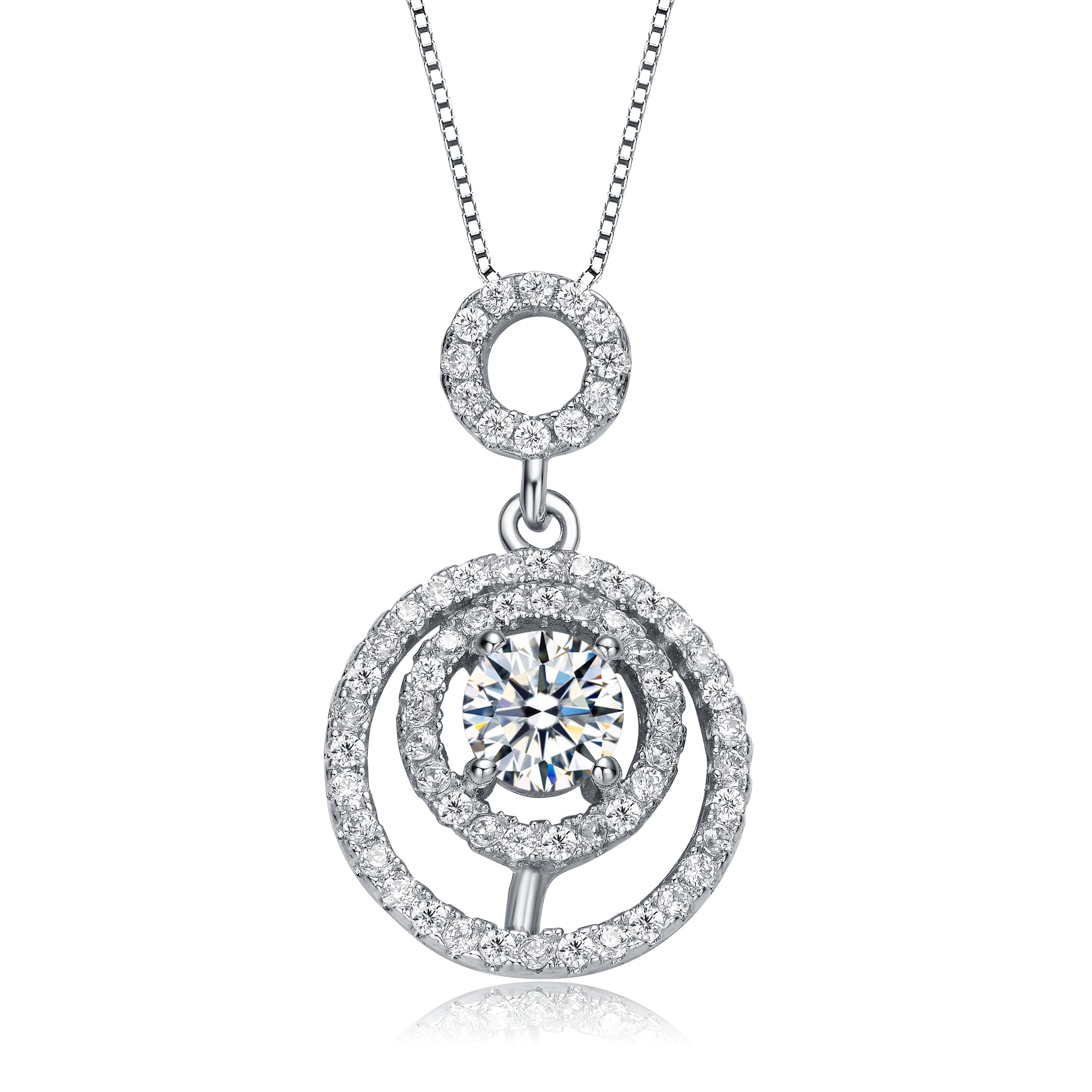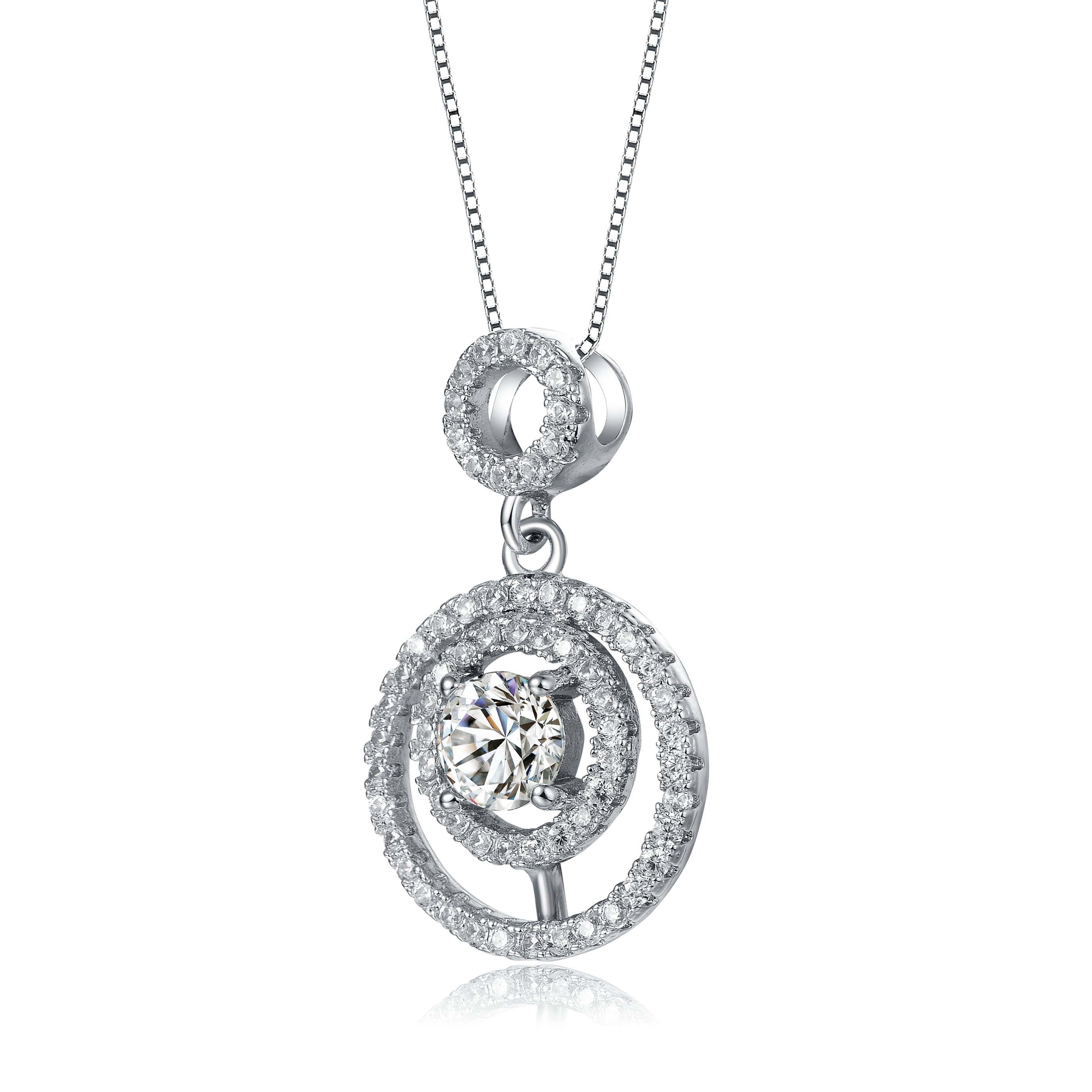 White Gold Plated with Double Halo Drop Solitaire Pendant Necklace. This elegant pendant necklace features a sparkling display of round brilliant cut cubic zirconia set in concentric halos and solitaire settings, giving it a double dose of effortless glamor. A durable box chain threaded through the invisible bail on the top makes this pretty pendant ready for wear. Designed in brightly polished white gold plating for a rich, luscious shine.