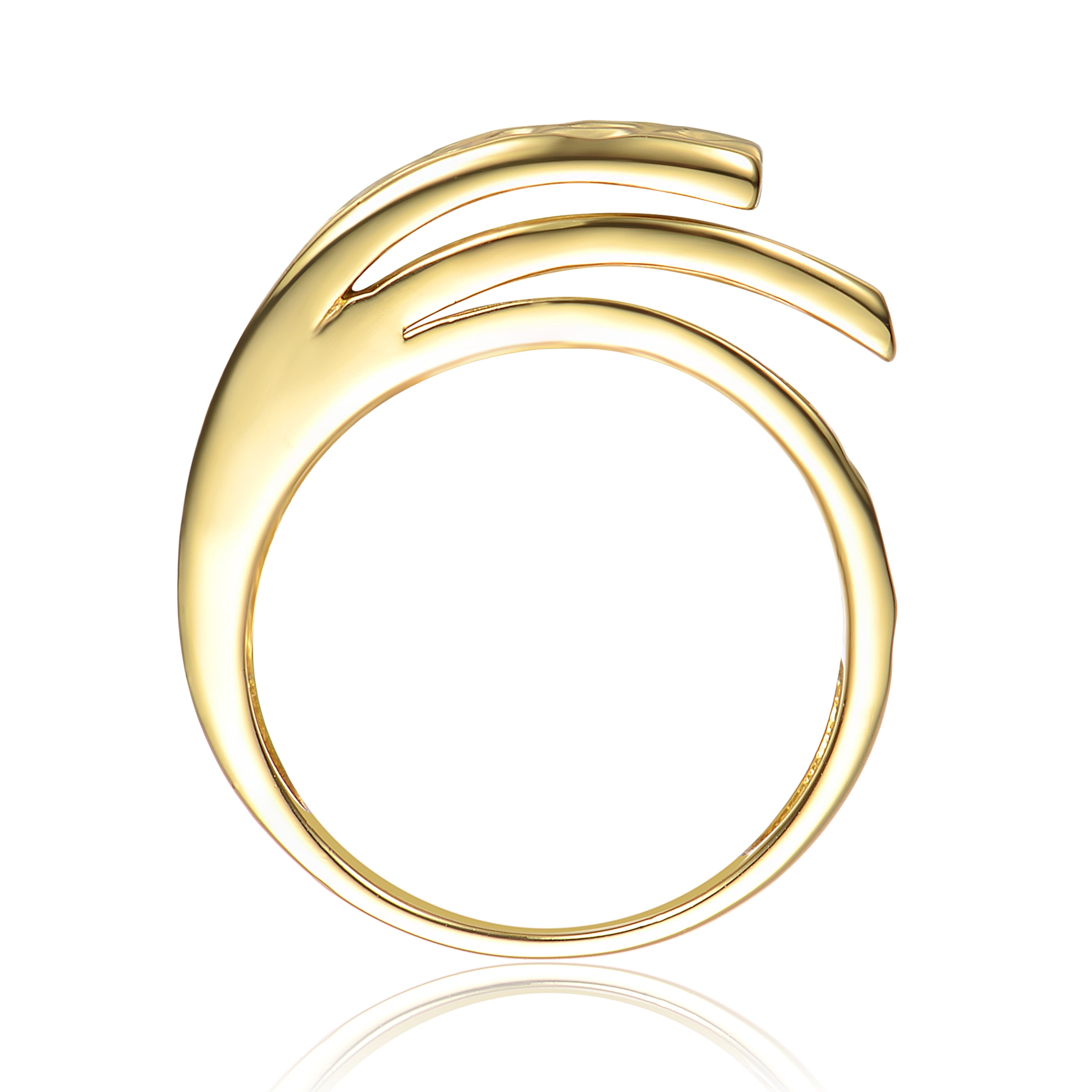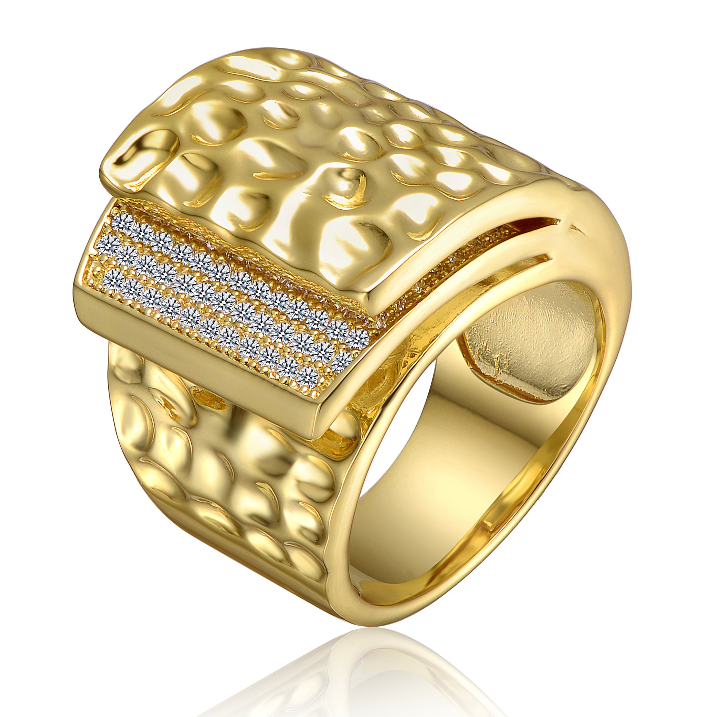 14k Gold Plated Cubic Zirconia Hammered Coiled Wrap Ring. Add glamor to your statement ring style, or wear this brightly polished 14k gold plated ring on any finger as the main attraction. A modern hammered finish and tapered coiled design are made to get noticed, sparkling with round brilliant cut cubic zirconia on the top. A smooth interior lends comfort to this design, making it the ultimate choice for your day or night wardrobe. Available in ring sizes: 6,7,8.