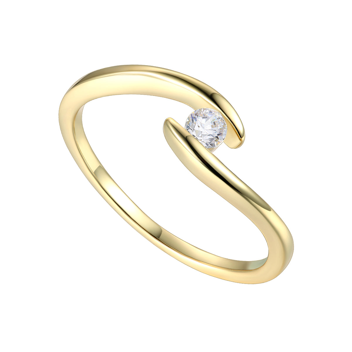 Cherish heartfelt memories by gifting this petite promise ring. A sparkling round brilliant cut cubic zirconia solitaire sits nestled in a slim bypass setting, giving it a graceful design. Add this brightly polished 14k yellow gold plated ring to your stacking ring collection, or wear it on its own for a look of understated elegance. Available in ring sizes 6,7,8.
