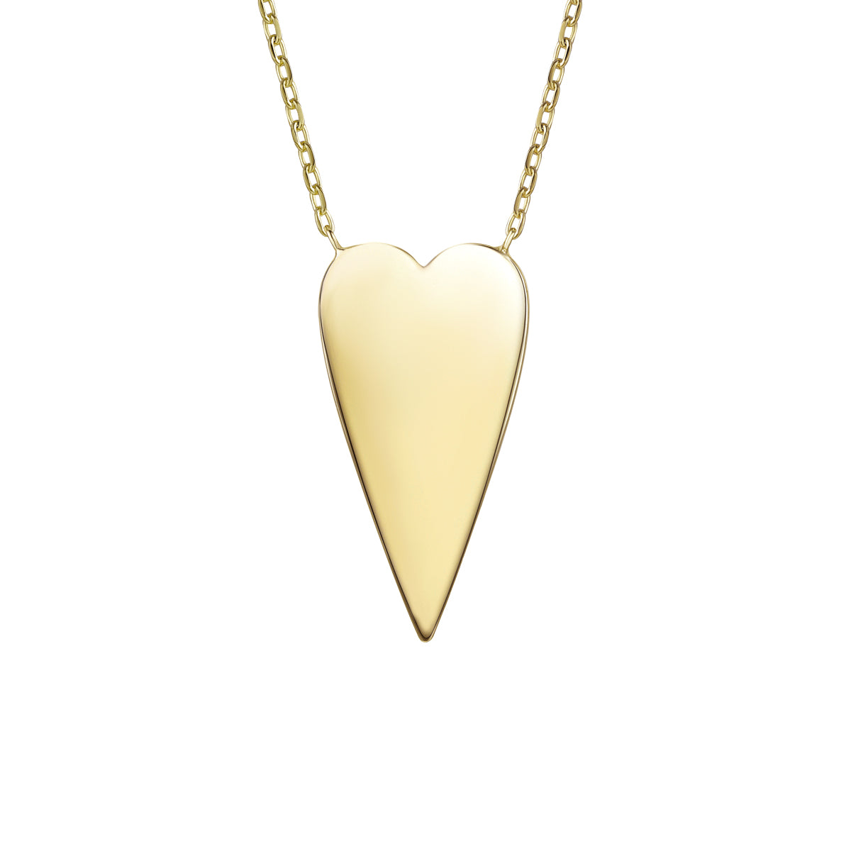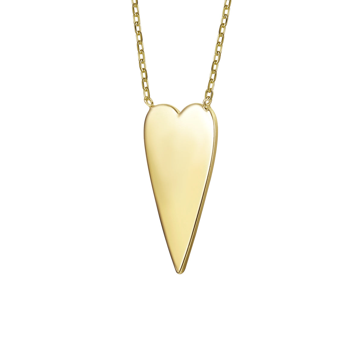Hearts symbolize love and happiness, perfect for gifting to anyone special! This contemporary necklace features an oblong heart pendant charm connected to a sturdy box chain. A lobster clasp keeps it secure, all crafted in 14k gold plating in a rich shine.