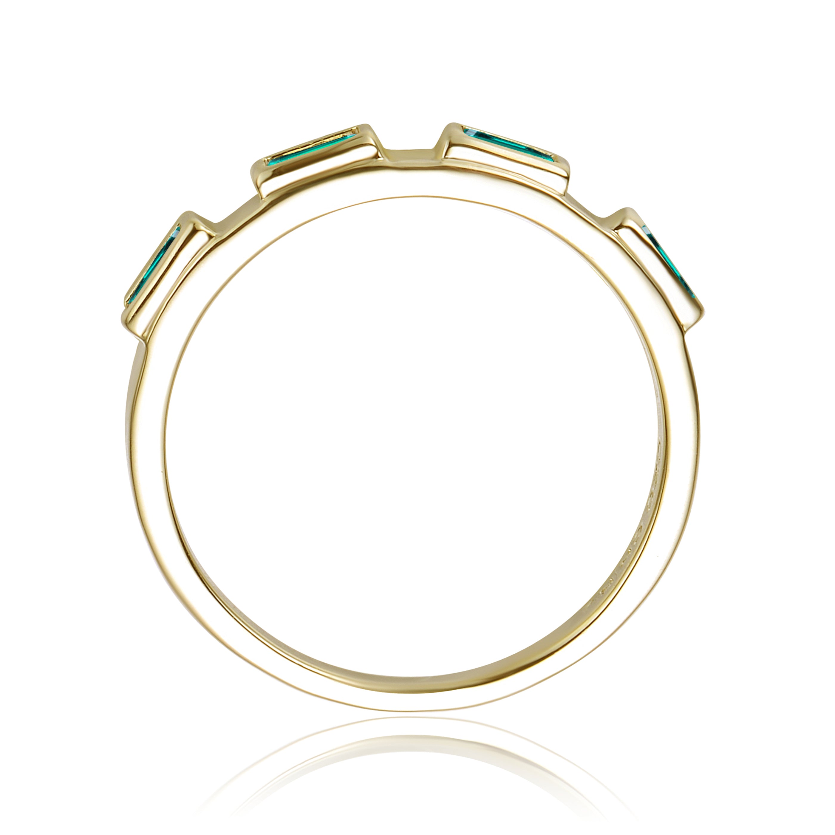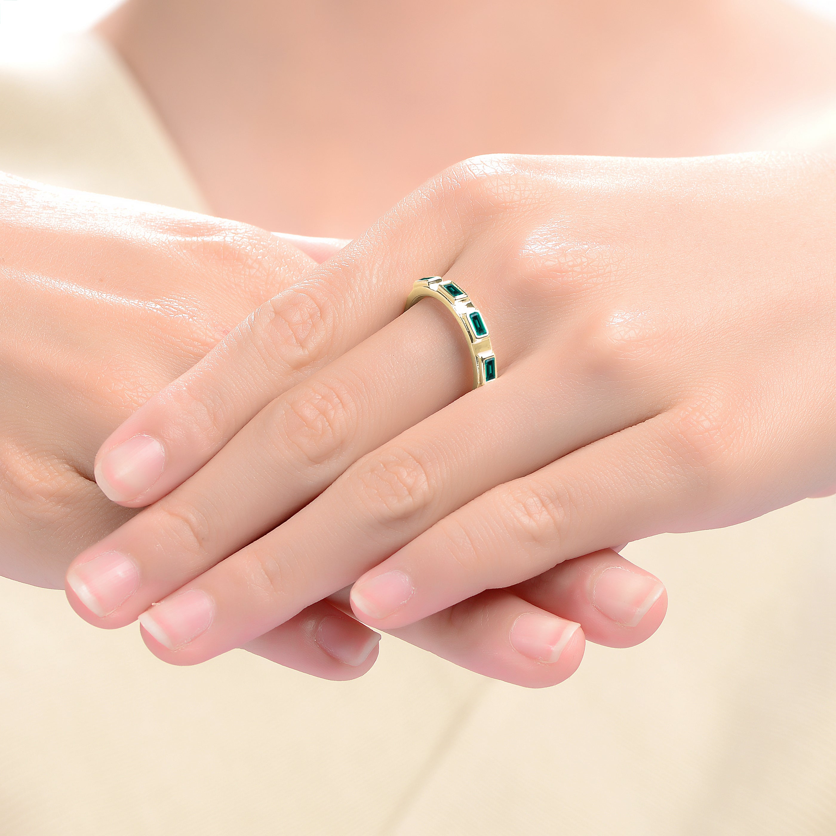 Elegant 14K Gold Plated Emerald Cubic Zirconia Band Ring. This item features interesting minimalistic design accented with emerald green baguette shaped cubic zirconia stones set in bezel on the band. Crafted with 14K Gold Plating and it is available in size 6, 7 or 8. Perfect piece of jewelry for stylish combinations. This item also makes a great gift as well.