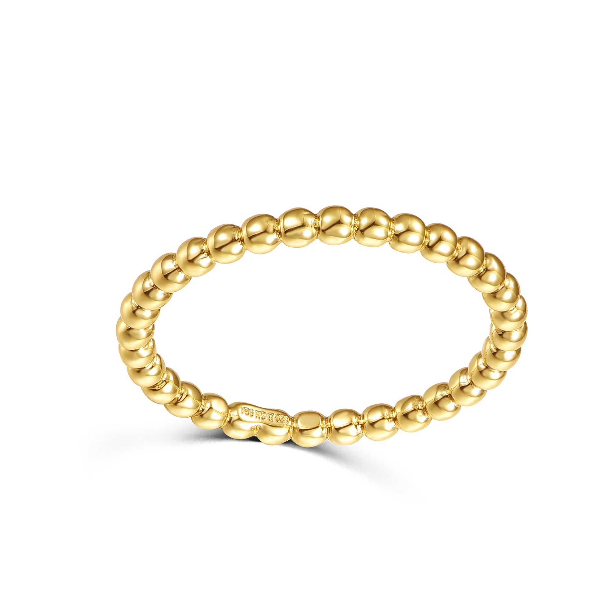 14k Yellow Gold Plated Beaded Stacking Ring Wedding Band. This classic 14k yellow gold plated band is endlessly versatile with its comfortable interior and bead-ball texture on the outside. Mix and match this delicate and chic band with other rings for a personalized accessorized look, or wear it solo on any finger. Pair it with an engagement ring or other statement solitaire ring for a different look each time. Ring is available in sizes 6,7 and 8.