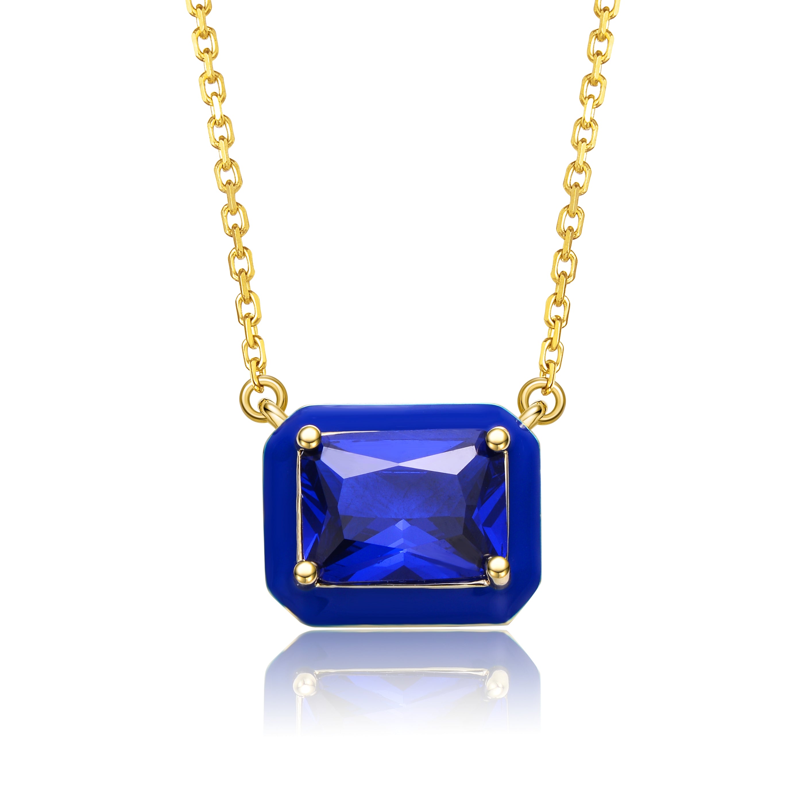 14k Yellow Gold Plated with Radiant Cut Blue Sapphire Cubic Zirconia Solitaire Enamel Halo Petite Pendant Necklace. Add vibrancy to your day or night wardrobe with this stunning 14k yellow gold plated necklace. A rectangular/radiant cut blue sapphirecubic zirconias (September Birthstone) accentuates the rich blue enamel halo frame. A shiny cable chain connected on each side of this glamorous pendant allows it to sit centered when worn, gracing the collarbone and securing by a lobster clasp.