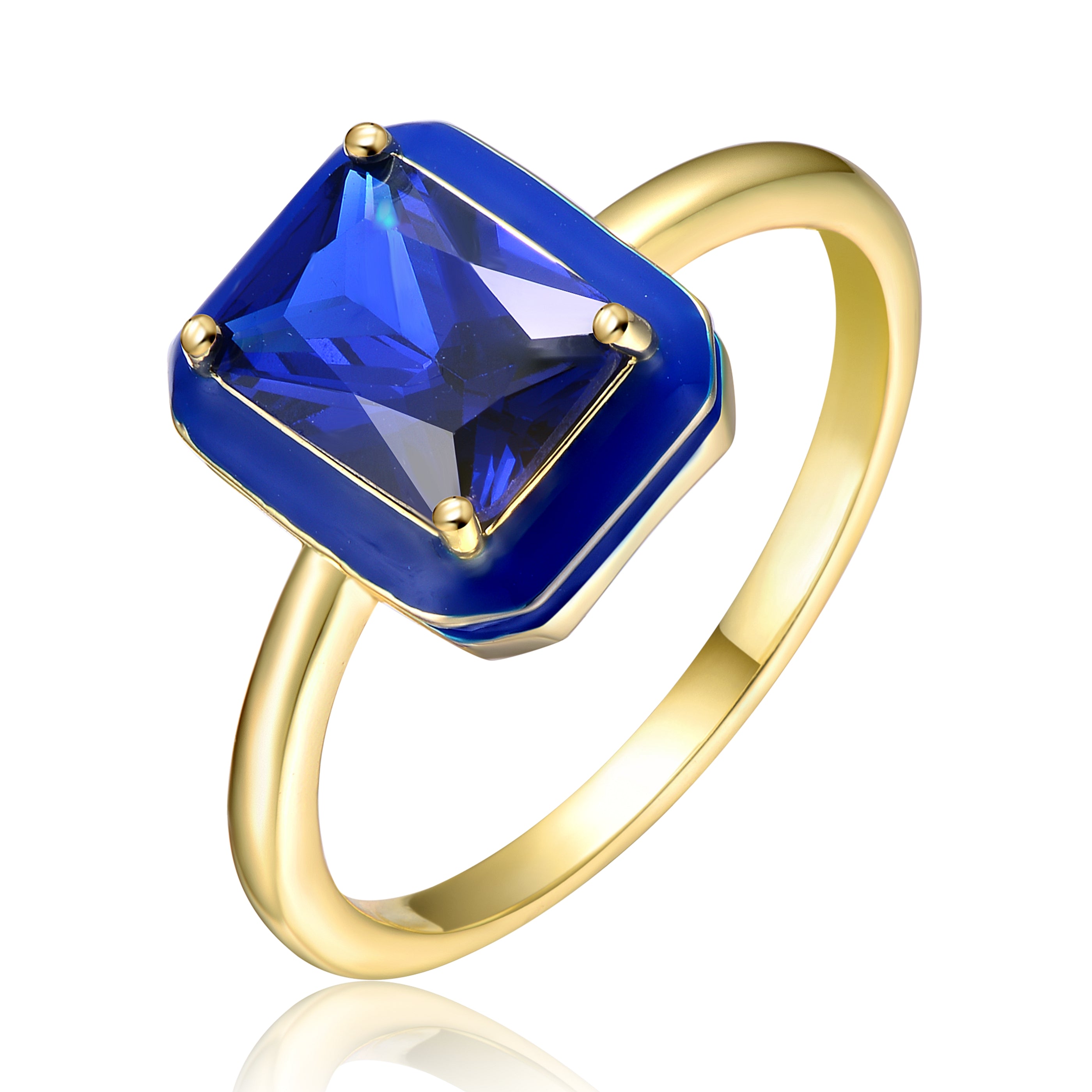 14k Yellow Gold Plated with Sapphire Cubic Zirconia Blue Enamel Radiant Halo Ring. Add vibrancy to your wardrobe with this brightly polished 14k yellow gold plated ring. A radiant cut blue sapphirecubic zirconia (September Birthstone) offsets rich cobalt enamel halo, giving this elegant ring a unique style made to get noticed. Finish your look with a colorful ring, perfect for stacking or worn solo on any finger of your selection. Available in ring sizes: 6-8.
