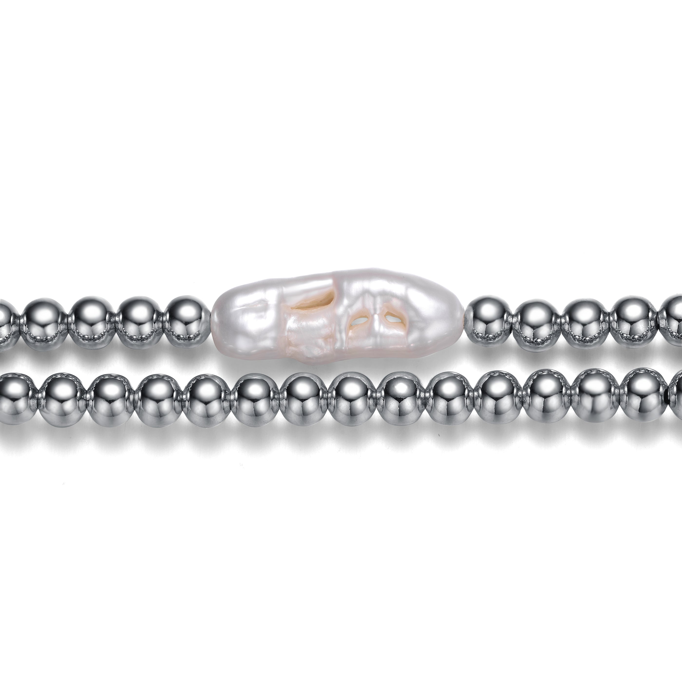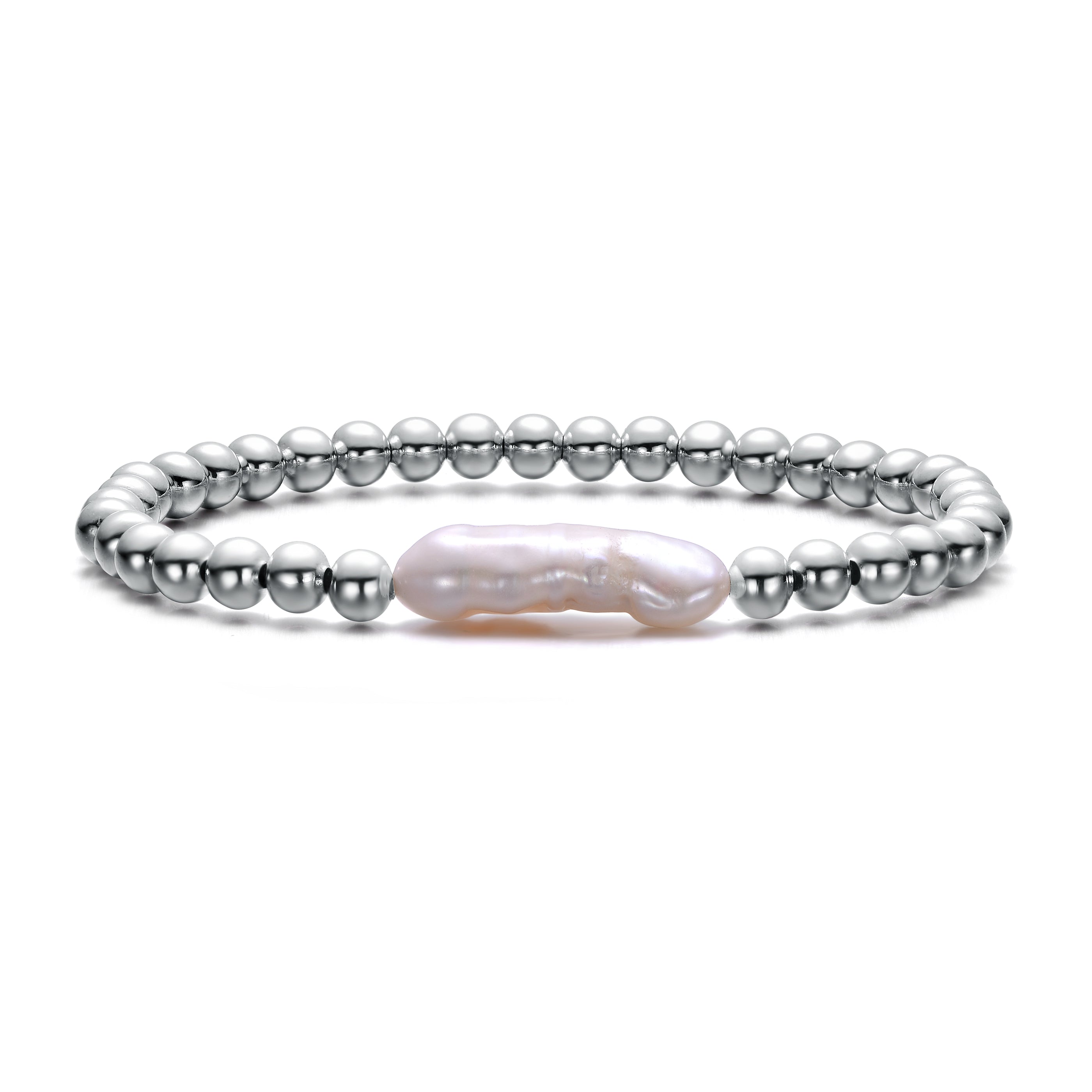 >Baroque Pearl Ball Bead Link Stretchable Layering Bracelet. Fuse modern trends with classic sophistication with this pretty pearl bracelet, finely crafted in a durable white gold plated shine. A shimmering baroque white pearl bead drill set in the middle captures attention with its nature-inspired beauty. Shiny ball beads on a sturdy cord exude a streamlined appearance, making this unique pearl bracelet perfect for elevating your layering bracelet look to another level of elegance. Available in 3 Plating color options.