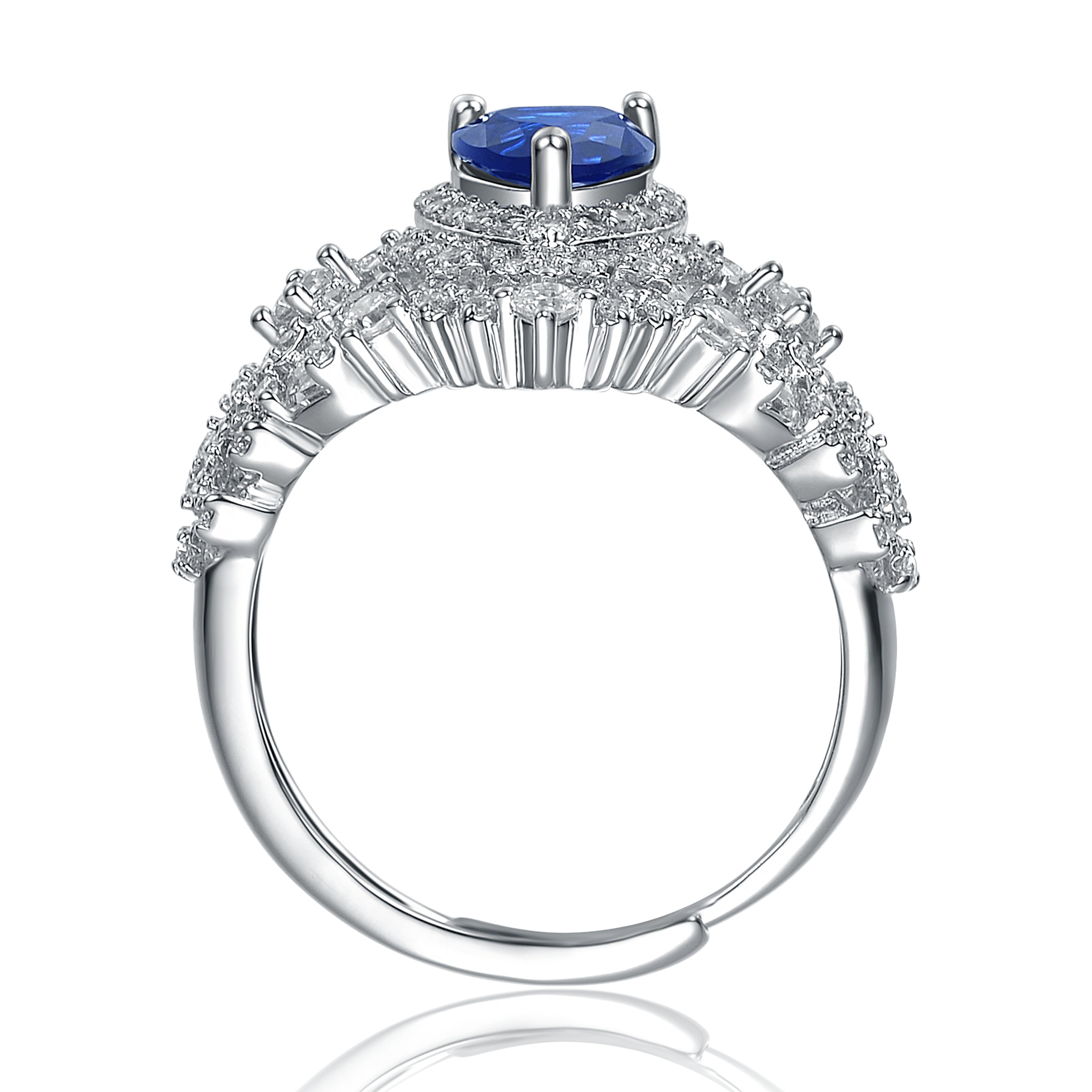 This stunning ring features a rhodium-plated band that provides a sleek, silver finish. At the center of the ring is a prominent, oval-cut sapphire cubic zirconia that exudes a deep blue hue. Surrounding the sapphire are sparkling clear cubic zirconia stones that mimic the brilliance of diamonds, adding to the ring’s luxurious appeal. The design includes intricate detailing on the band, enhancing its elegance and making it a perfect piece for special occasions or as a sophisticated addition to any jewelry collection.