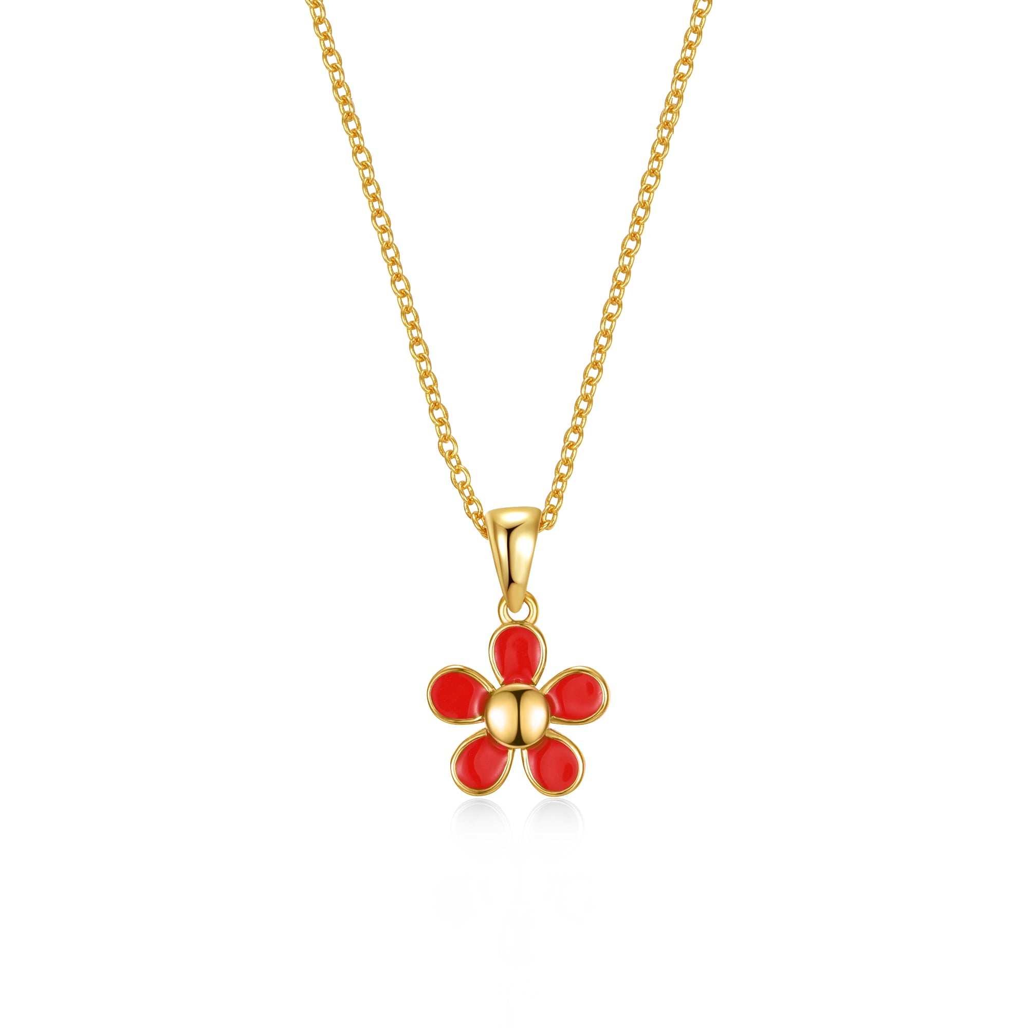 14k yellow gold plated red enamel blooming flower layering necklace. Add the beauty of a fresh garden to your layering necklace collection with this 14k yellow gold plated necklace. Rich, red enameling on the flower and a dollop of gold accenting bring this vibrant flower to life in chic style. A delicate cable chain secured with a lobster clasp keeps this dainty necklace secure, all in a rich shine.