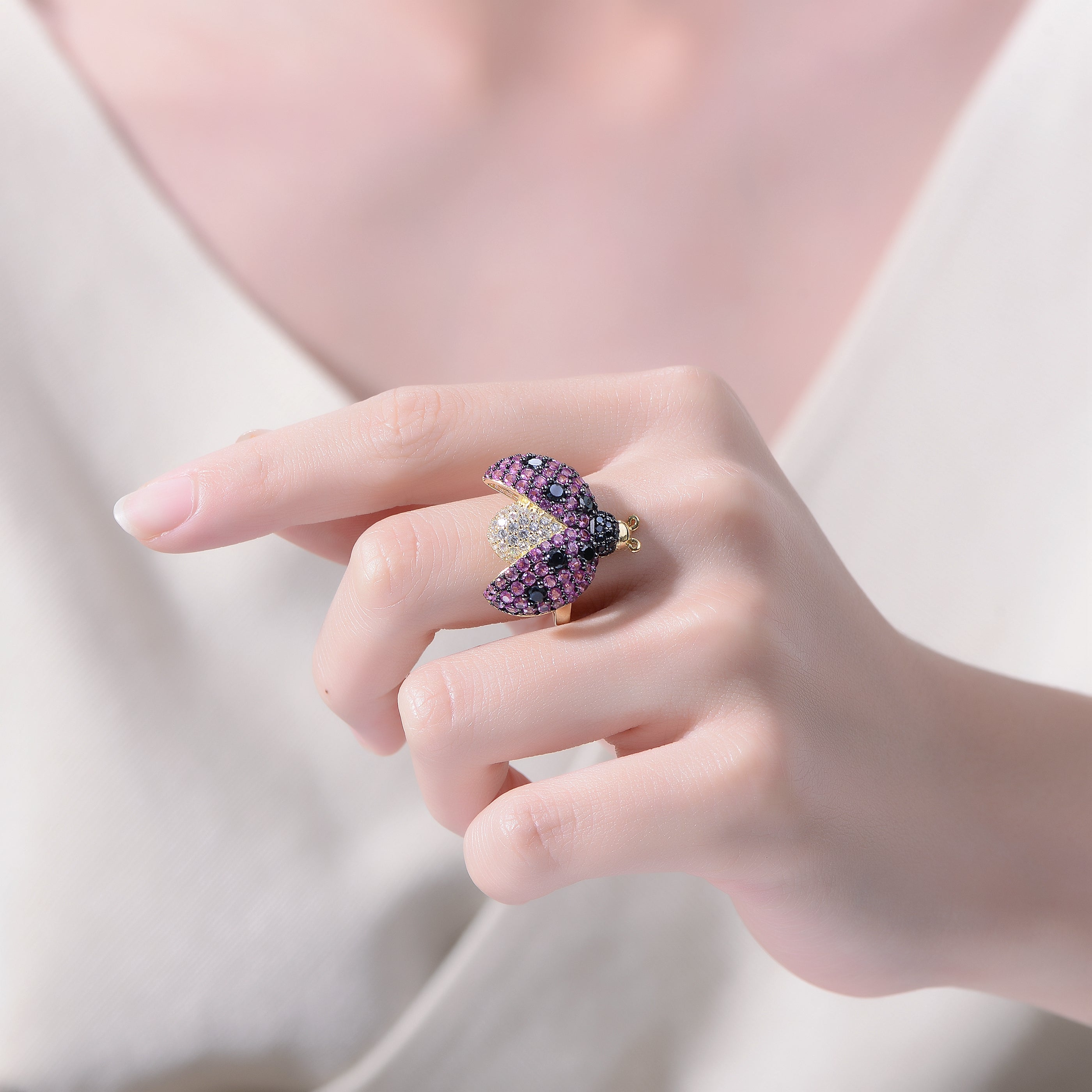 Marvellous Gold and Black Plated Cubic Zirconia Ring. This ring features interesting ladybug design made out of two symetrical black plated pieces as wings and gold plated abdomen. Each wing features large black round cubic zirconia stones accented by small round pink cubic zirconia stones set in prong setting. The abdomen features clear round cubic zirconia stones set in gold plated prong setting. Crafted with Gold and Black Plating and it is available in sizes 6, 7 or 8. Perfect piece of jewelry for stylish combinations. This item also makes a sensational gift.