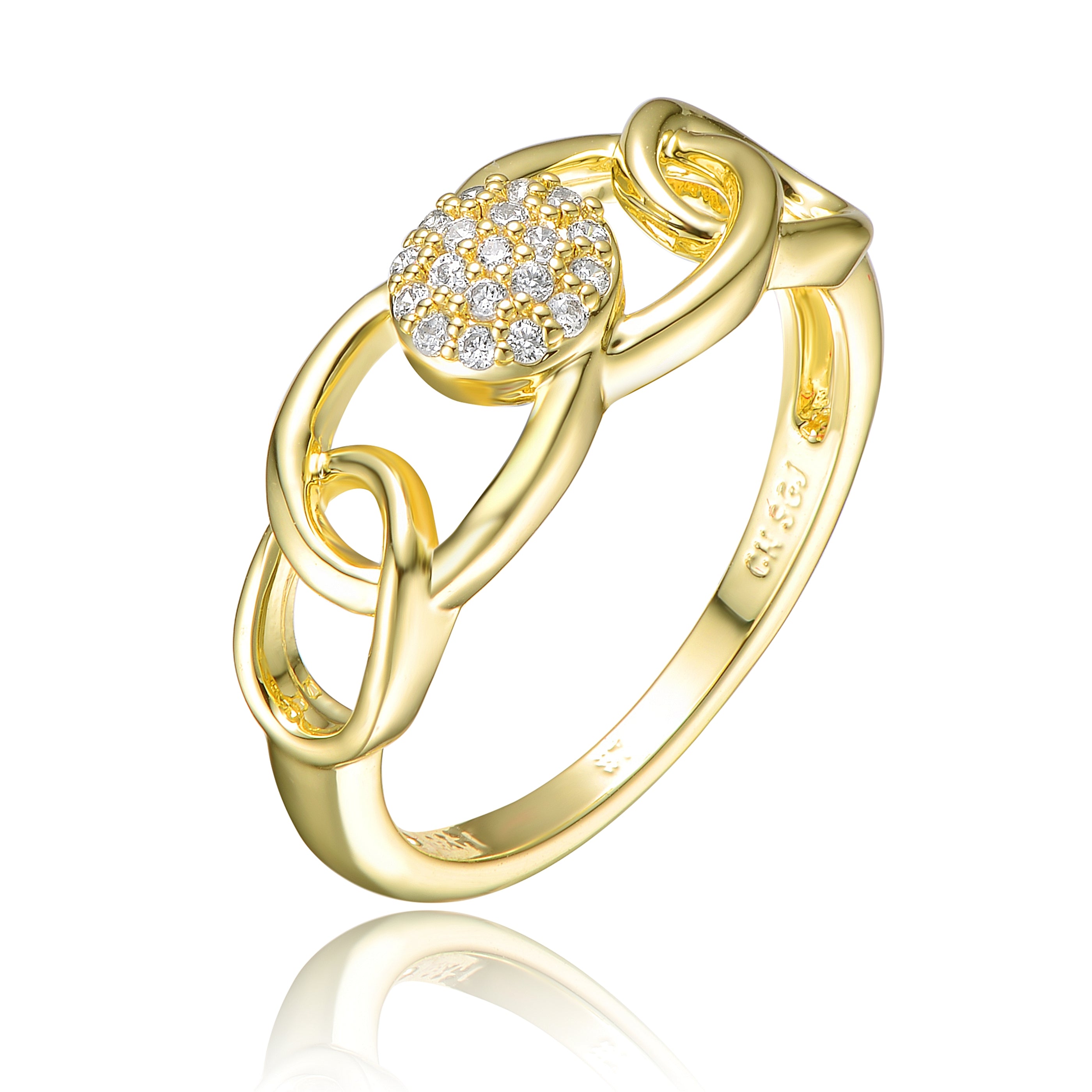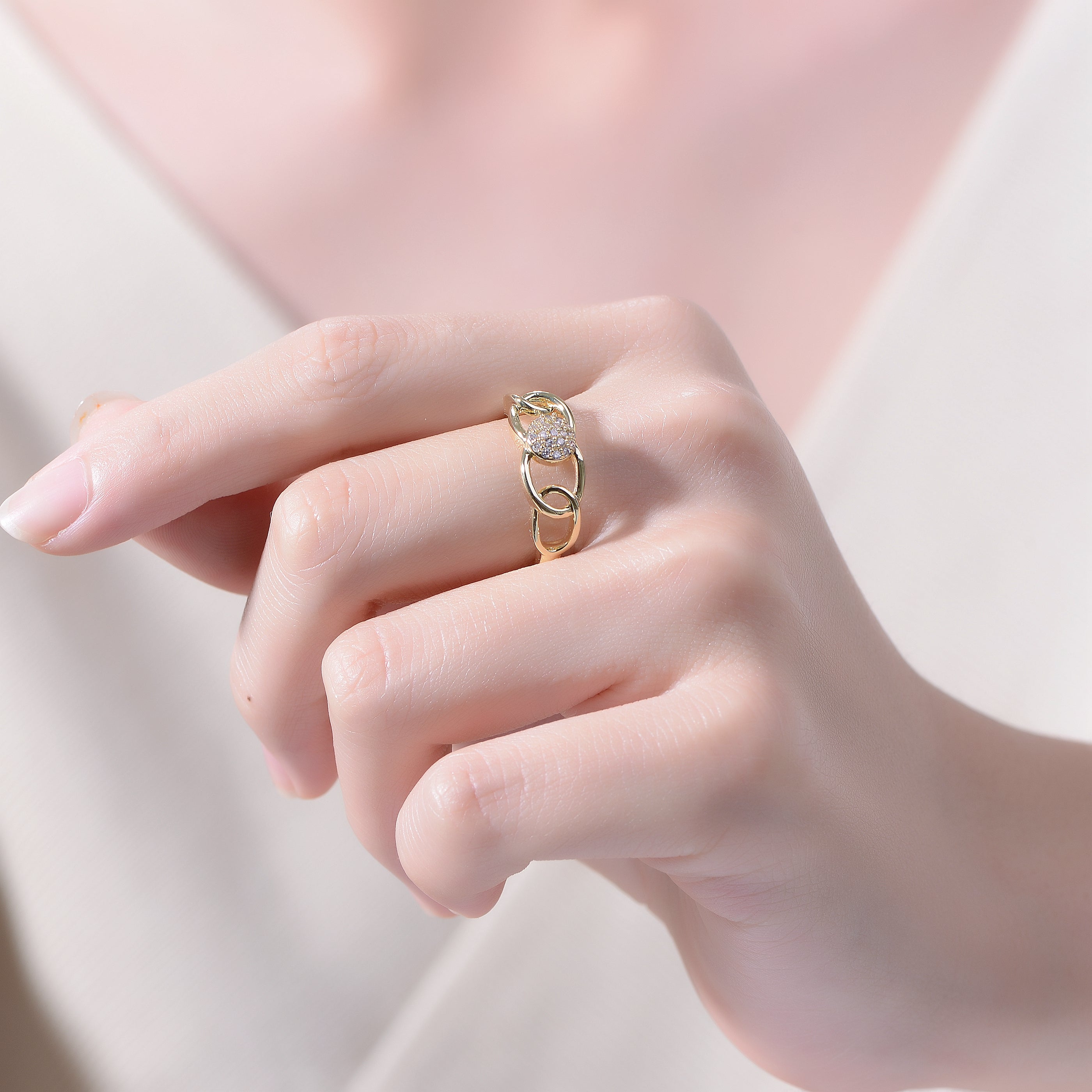 Stylish Gold Plated Clear Cubic Zirconia Geometrical Ring. This ring features chain alike design made out of two types of chain: smaller and large, with a round cented paved with small round clear cubic zirconia. Crafted with Gold Plating and it is available in sizes 6, 7 or 8. Perfect piece of jewelry for all combinations. This item also makes a sensational gift.