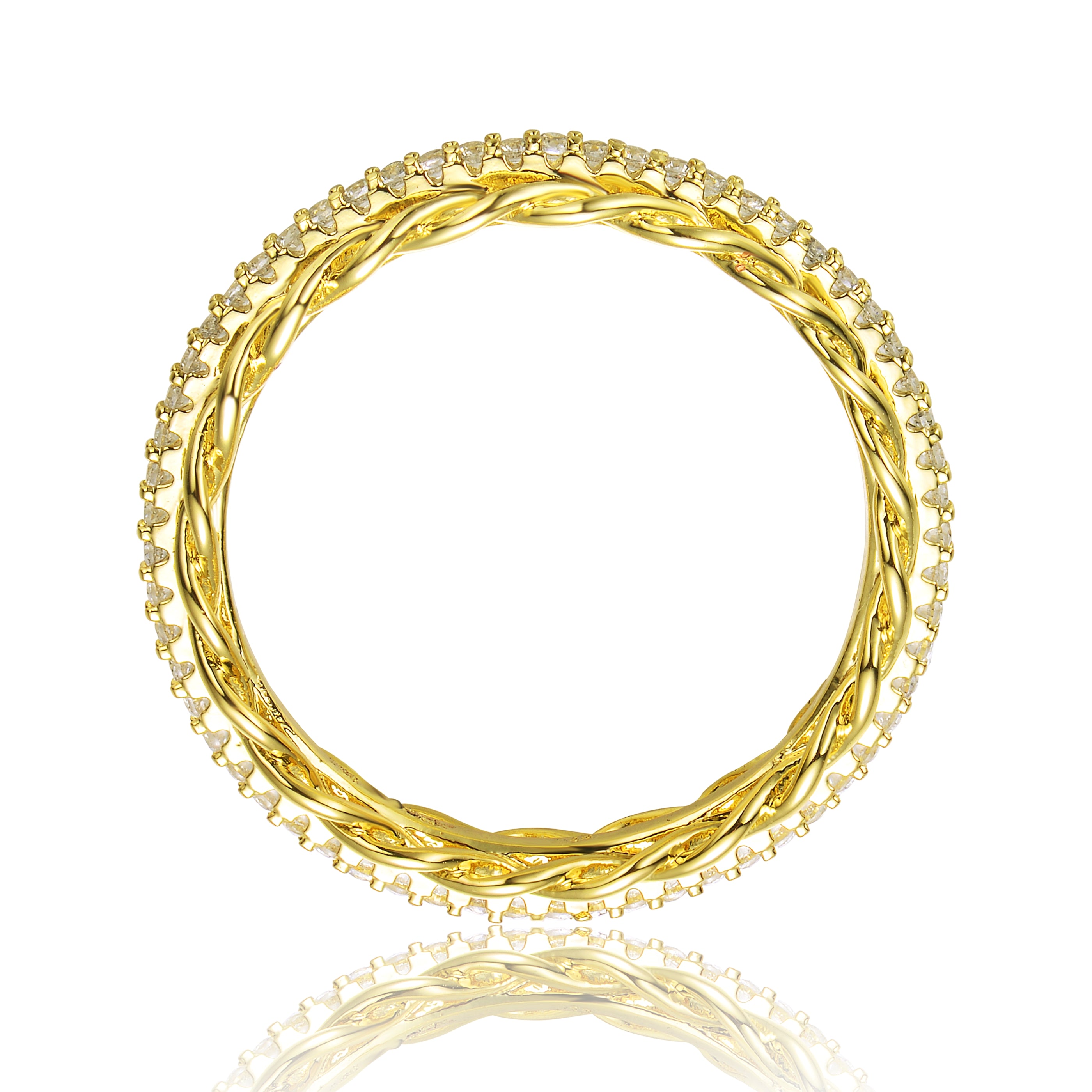 Gold Plated Cubic Zirconia Chain Band Ring. This ring features chain alike design made out of two types of bands: two bands on the ends that feature intertwined design and a band in the center made out of small clear round cubic zirconia stones paved. Crafted with Gold Plating and it is available in sizes 6, 7 or 8. Perfect piece of jewelry for all combinations. This item also makes a sensational gift.