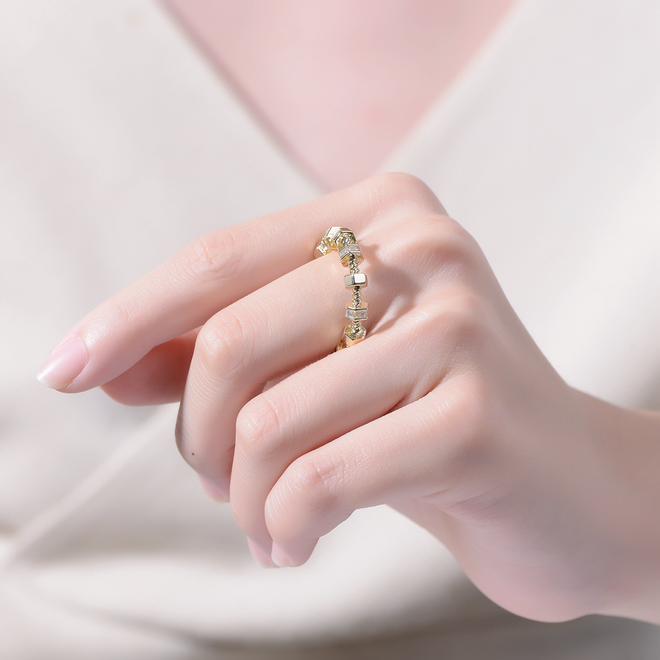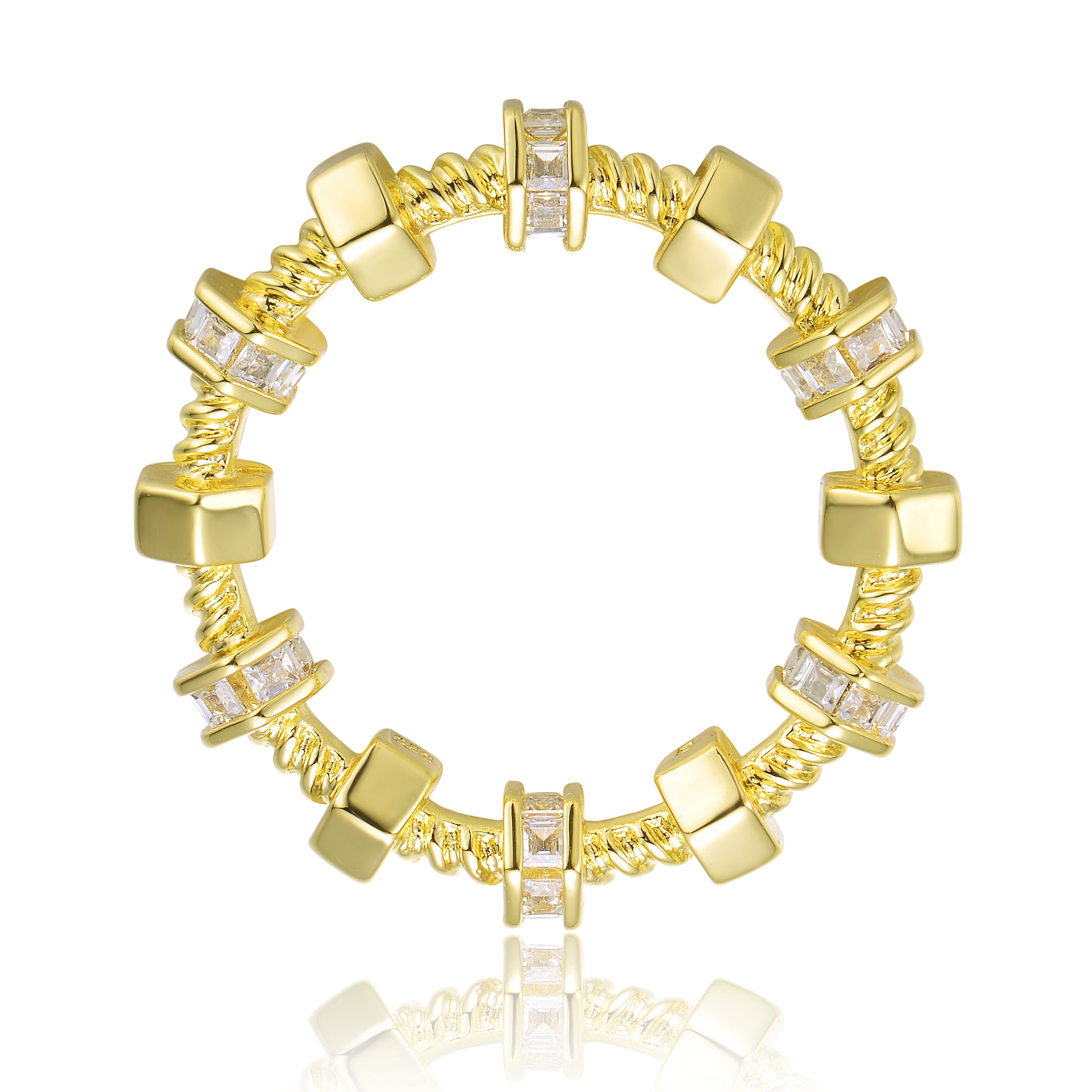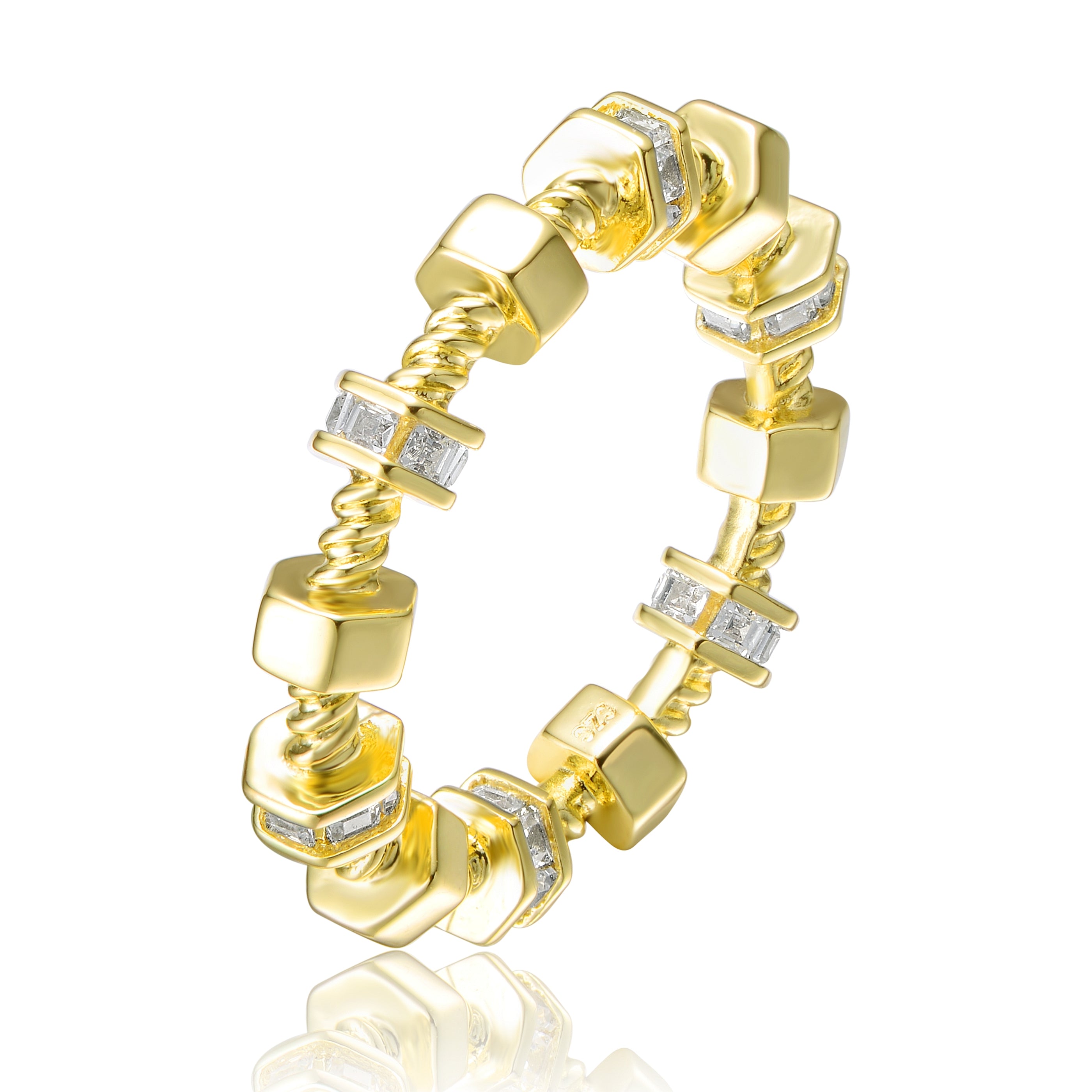 Gold plated multi colored cubic zirconia band ring. This ring features interesting "nut" alike band design made out of twisted band decorated alternately with one gold plated solid nut and one cubic zirconia accented nut. The clear emerald cut cubic zirconia stones are in channel setting within the nut. Crafted with gold plating and it is available in sizes 6, 7 or 8. Perfect piece of jewelry for stylish combinations. This item also makes a sensational gift.