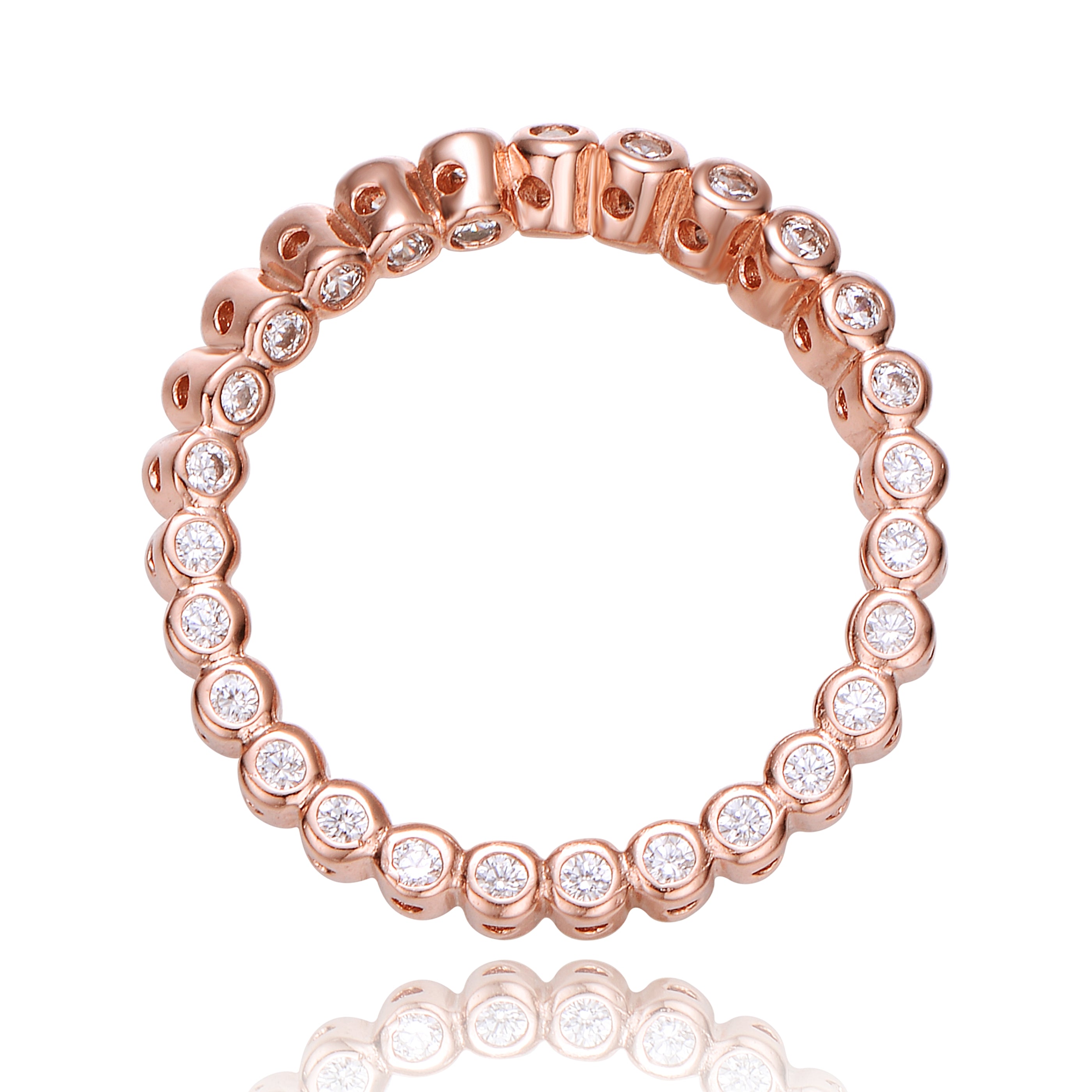 Sophisticated rose gold plated clear cubic zirconia band ring. This ring features minimalistic band design made out of small clear round cubic zirconia set in bezel, connected between, forming a wavy design. Crafted with rose gold plating and it is available in sizes 6, 7 or 8. Perfect piece of jewelry for stylish combinations. This item also makes a sensational gift.