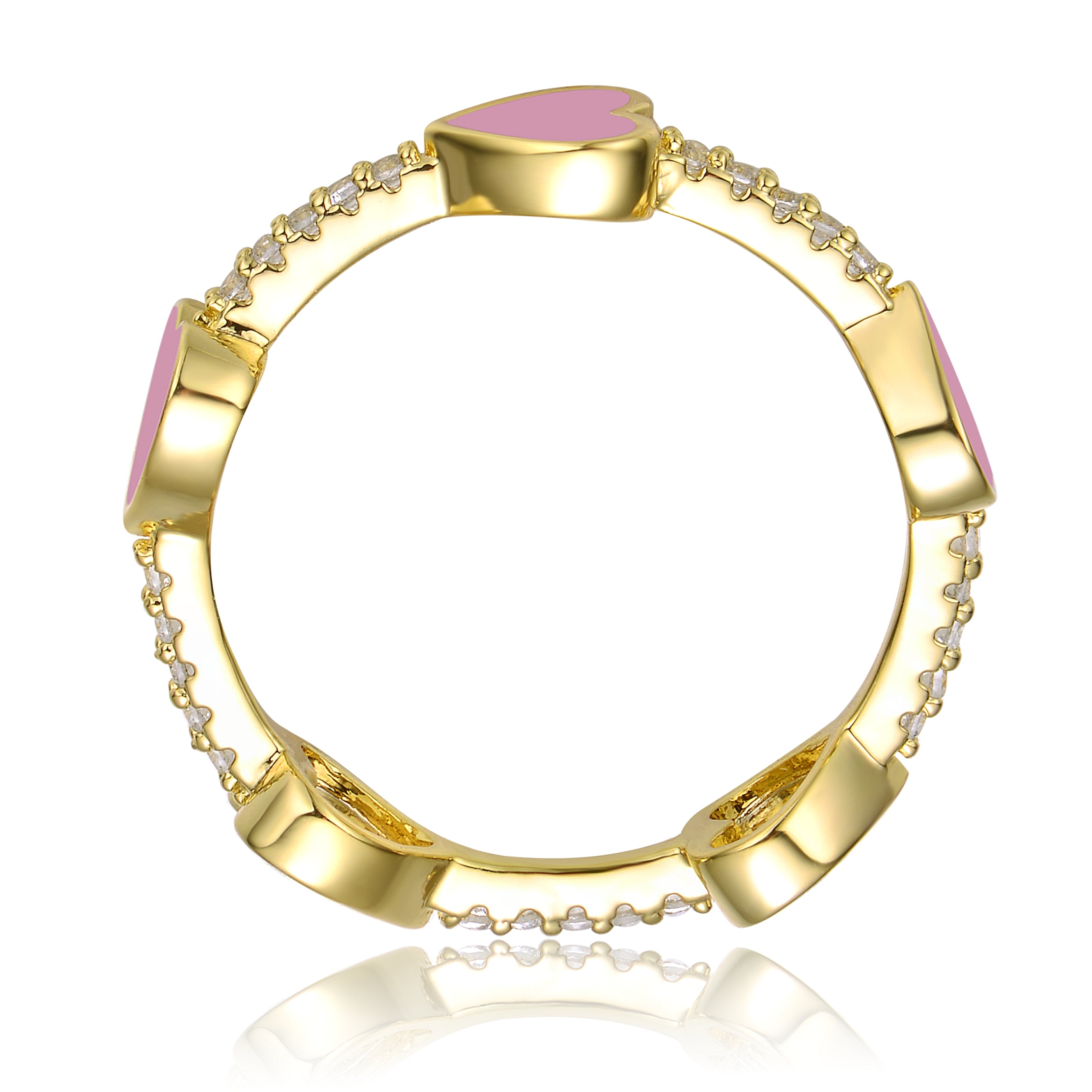 Kids/Teens 14k Yellow Gold Plated with Cubic Zirconia Pink Enamel Heart Stacking Ring. Add this enchanting 14k yellow gold plated stacking ring to your highly accessorized look, or wear it solo as the main focal point. Sparkling round brilliant cut cubic zirconias prong set on the slim band alternate with light cotton candy pink enamel hearts, giving this trendy ring pretty color and glitter. Select this cute ring as a gift or treat yourself. Available in ring sizes: 4-7.