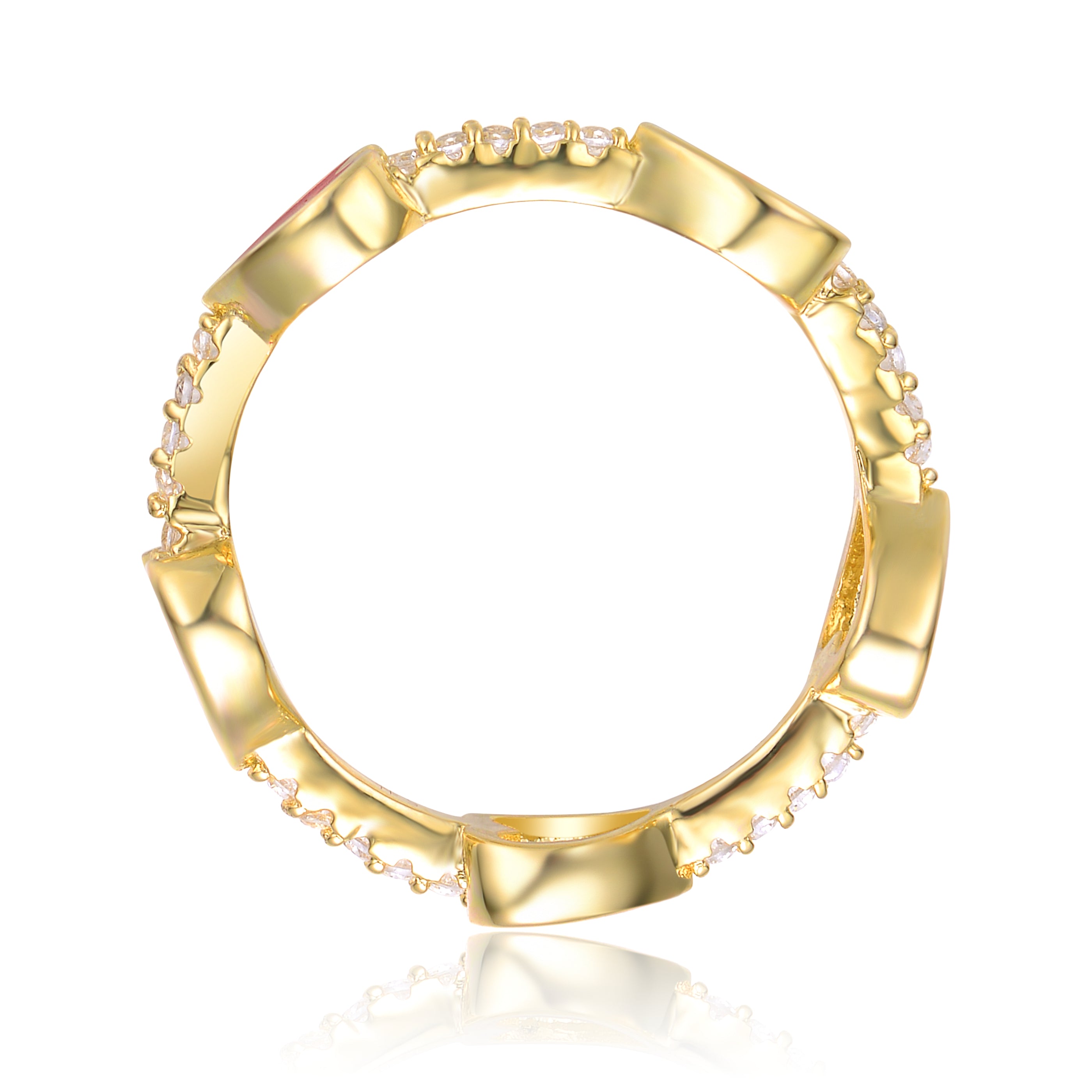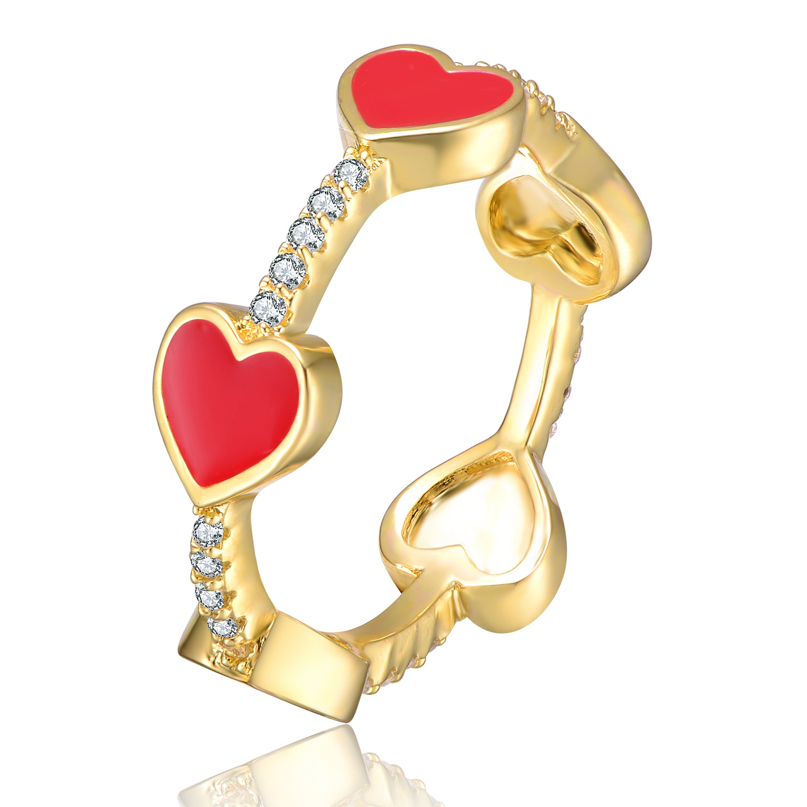Kids/Teens 14k Yellow Gold Plated with Cubic Zirconia Red Enamel Heart Stacking Ring. Add this enchanting 14k yellow gold plated stacking ring to your highly accessorized look, or wear it solo as the main focal point. Sparkling round brilliant cut cubic zirconias prong set on the slim band alternate with Red enamel hearts, giving this trendy ring pretty color and glitter. Select this cute ring as a gift or treat yourself. Available in ring sizes: 4-7.