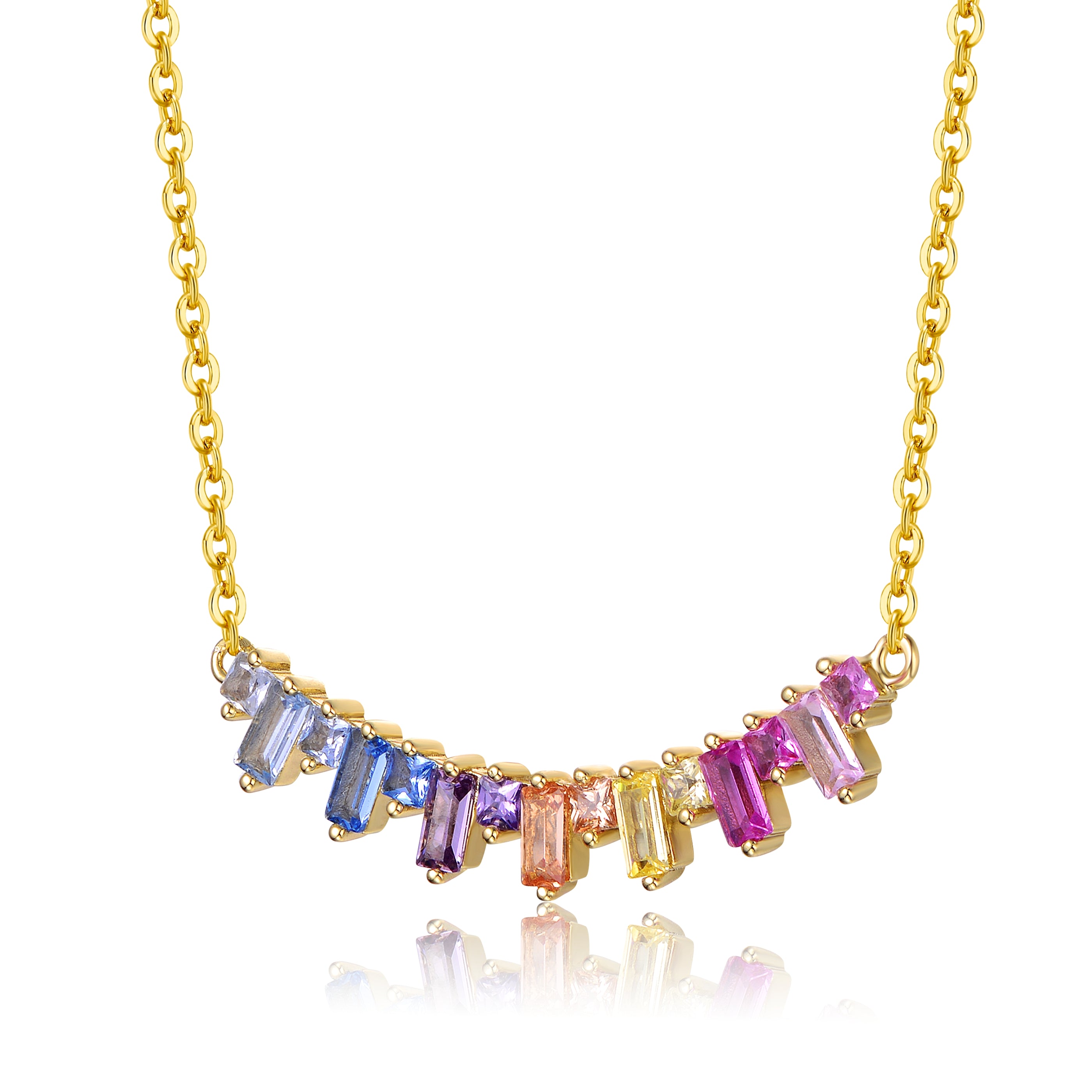 14k Yellow Gold Plated with Rainbow Gemstone Cubic Zirconia Linear Cluster Fringe Pendant Necklace