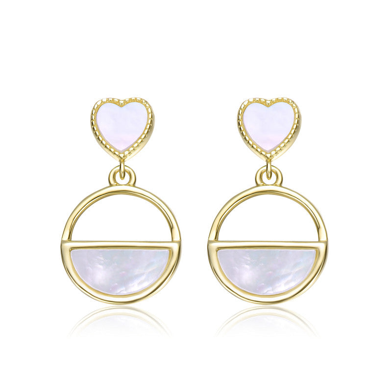 14K Gold Plated With White Mother of Pearl Heart & Circular Drop Earrings
