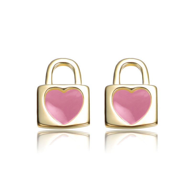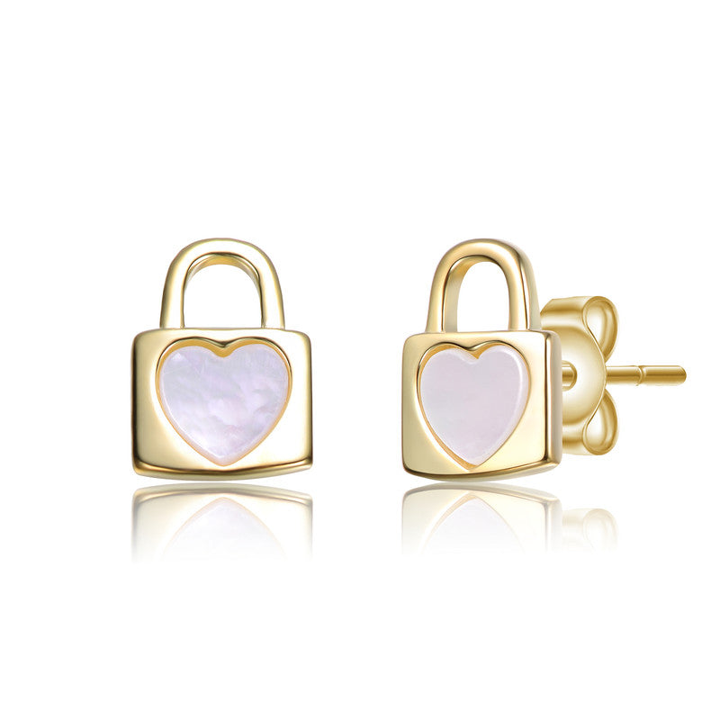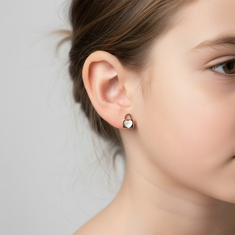 14K Gold Plated with White Mother Of Pearl Heart-Shaped Lock Earrings For Kids