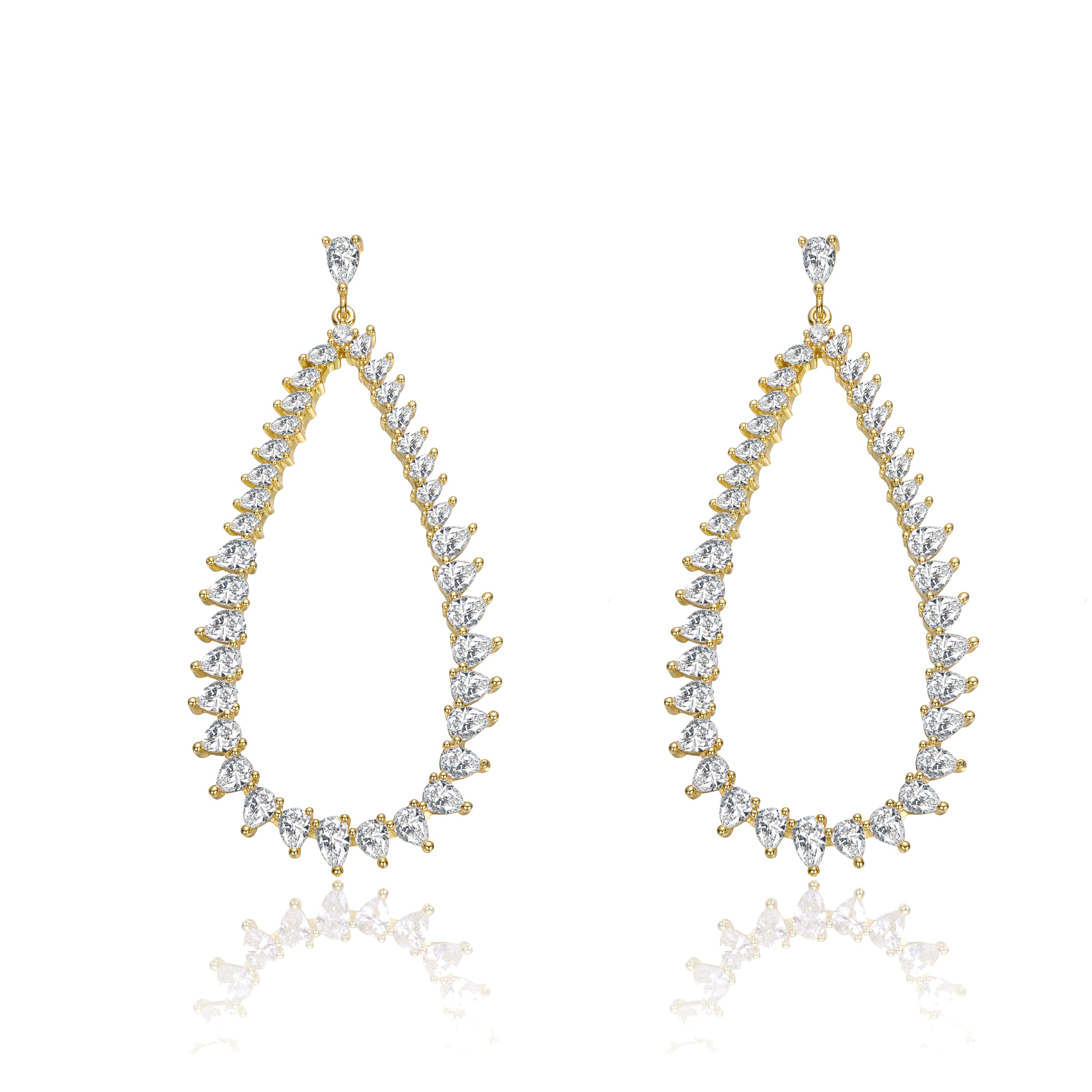 14k Gold Plated Cubic Zirconia Raindrop Front-Facing Hoop Earrings. These brightly polished 14k gold plated front-facing hoop earrings feature sparkling round brilliant cut cubic zirconia prong set around a tubular raindrop silhouette. Pin and post backs keep these pretty earrings in place, allowing them to sit comfortably close to the earlobes. Elevate any wardrobe with these pretty earrings, adding the ultimate accessory to your day or night wardrobe.