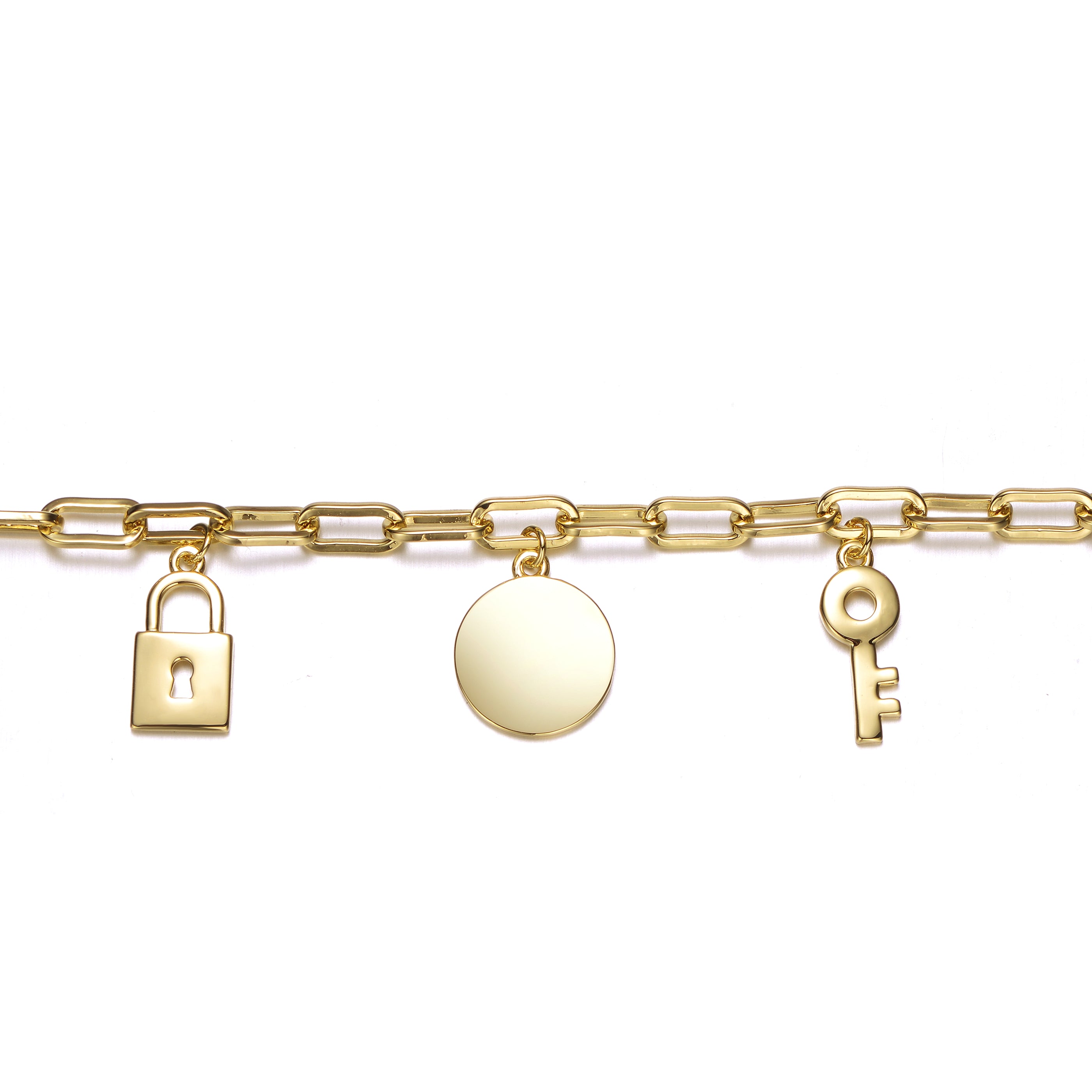 Elegant 14K Gold Plated Cubic Zirconia Three Charm Bracelet. This bracelet features three charm design: a locket, round bar and a key made out of solid metal. The charms are connected to a paperclip chain. Crafted with 14K Gold Plating and secure with lobster claw closure. This item also makes a sensational gift for a special birthday or occasion.