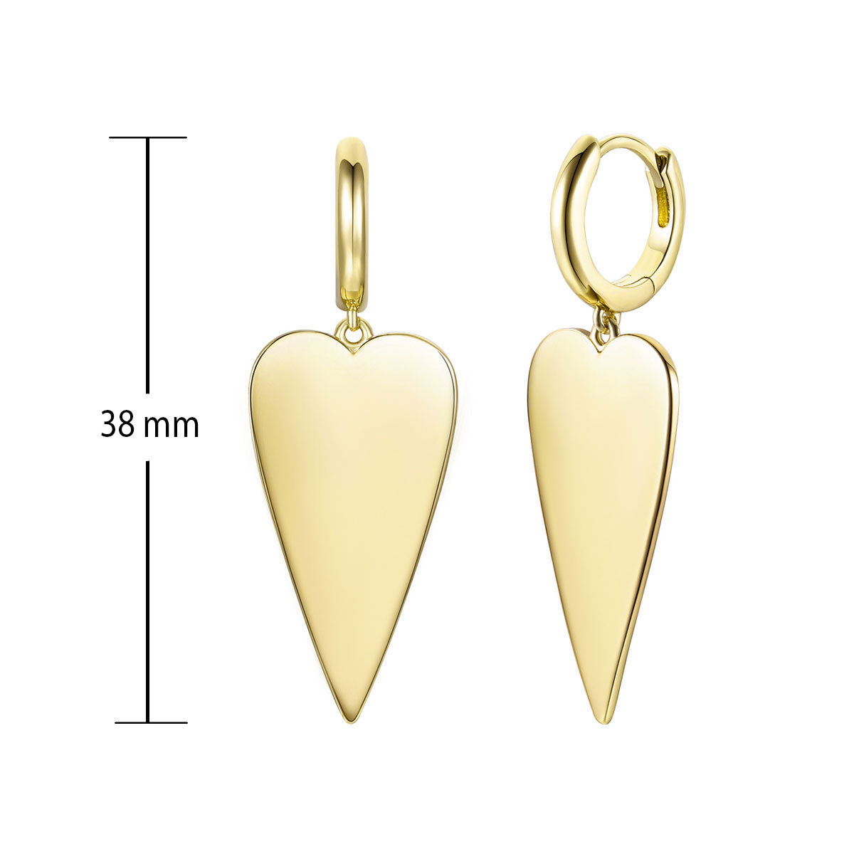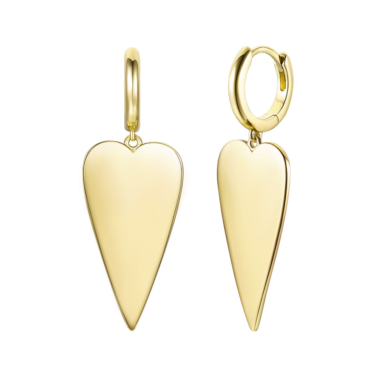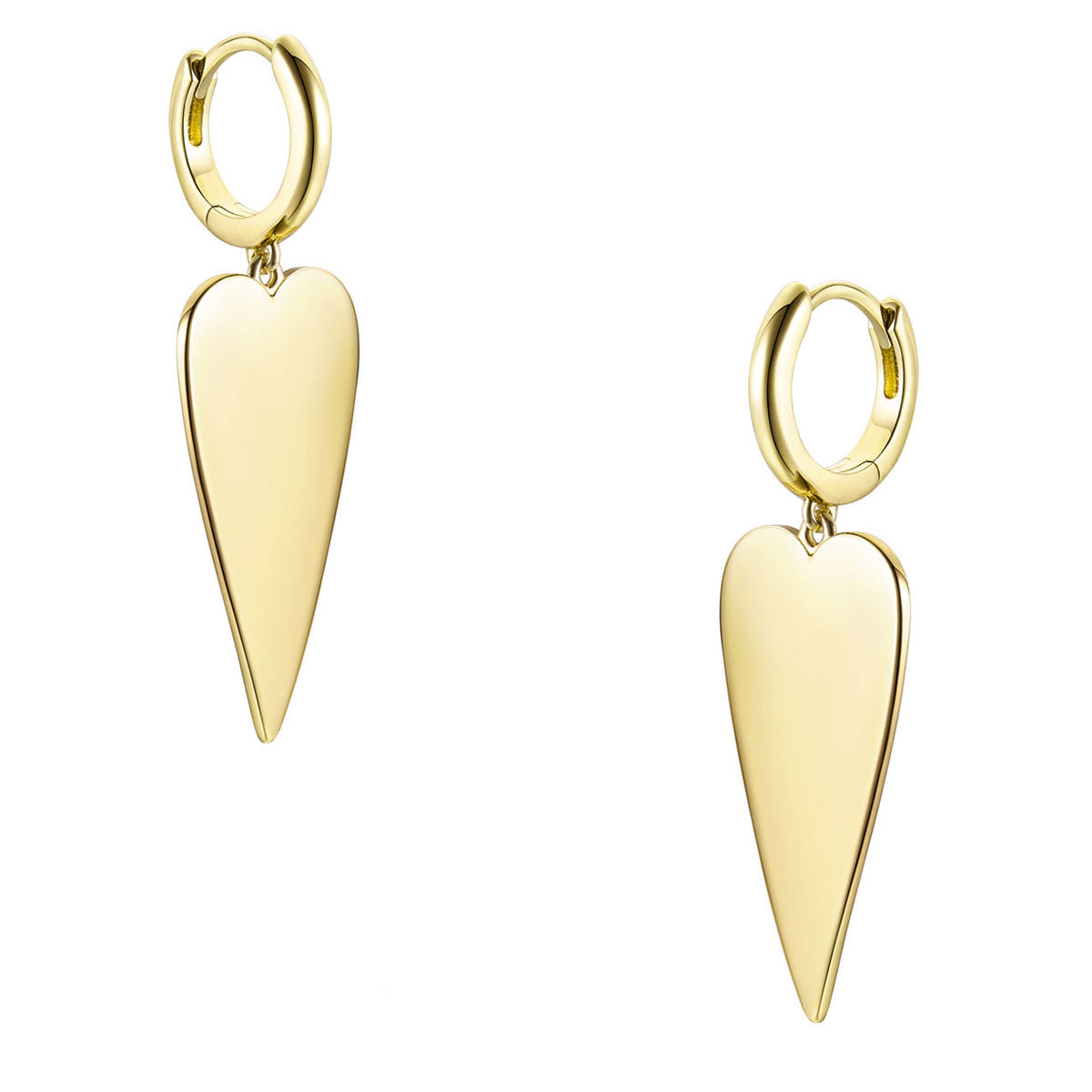Add happiness to your day or night wardrobe wearing these dangle earrings! Smooth elongated heart charms drop from mini hoops, giving these earrings romantic yet trendy style. Curved posts provide an infinity fit close to the earlobes. Designed in 14k gold plating.