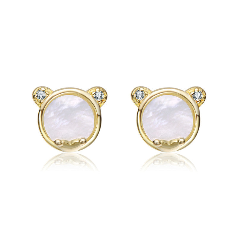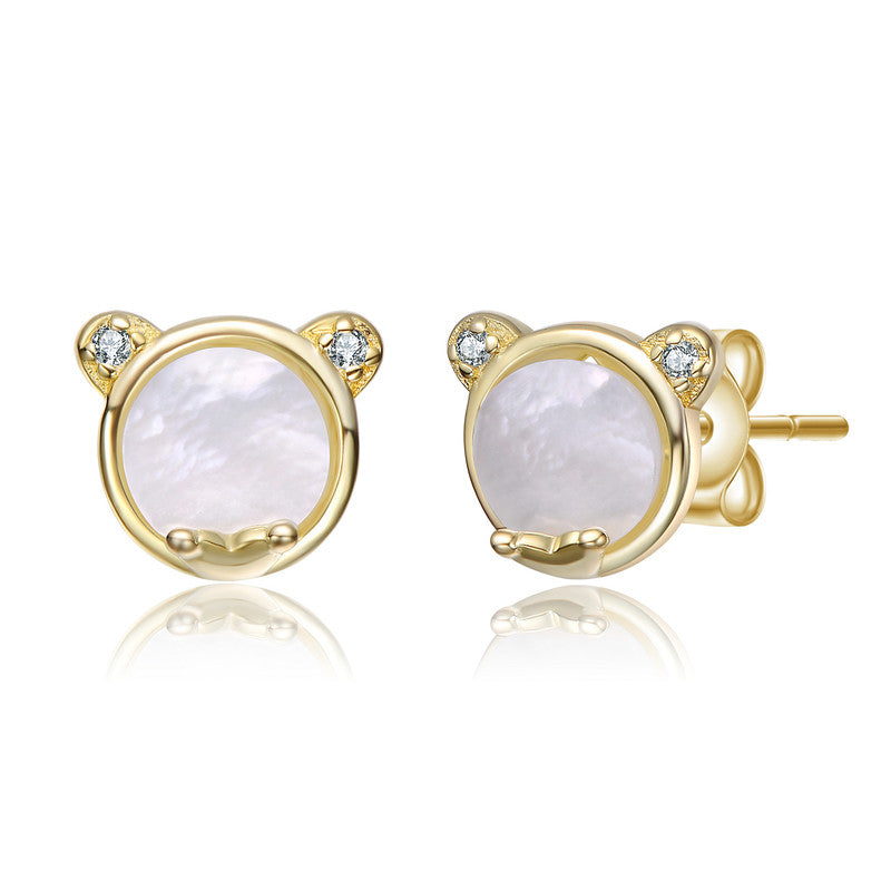 14K Gold Plated Mother Of Pearl & Clear Cubic Zirconia Bear Stud Earrings For Kids