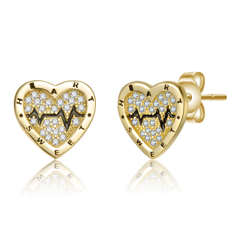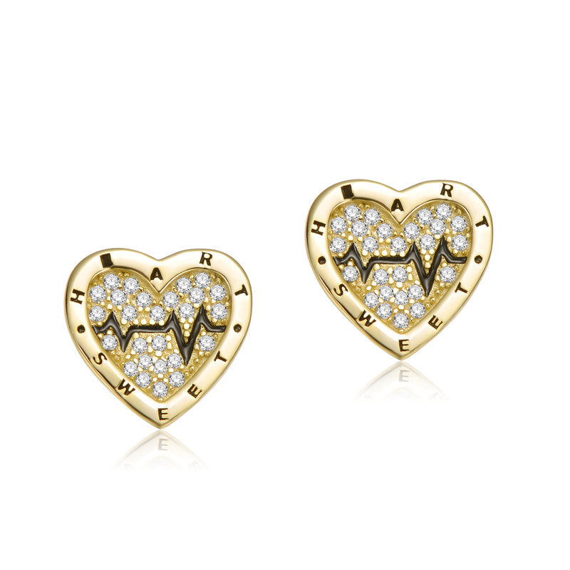 14K Gold Plated with Black Enamel & Clear Cubic Zirconia Heartbeat Stud Earrings