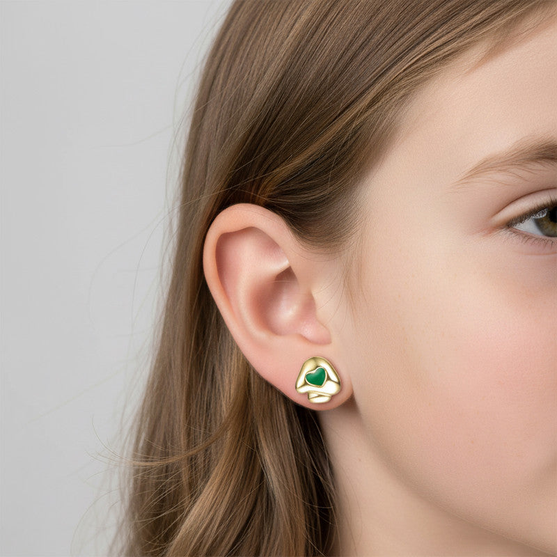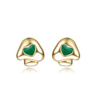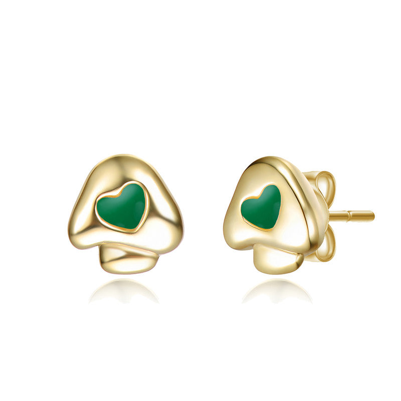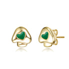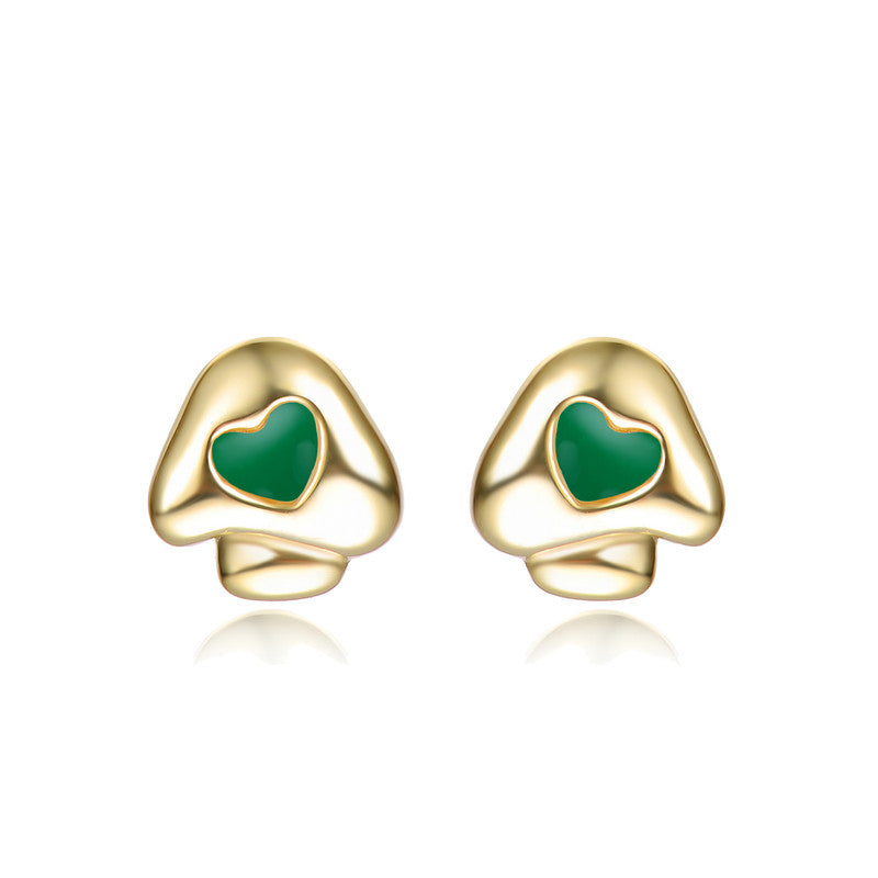 14K Gold Plated with Elegant Green Enamel Heart Mushroom Design Stud Earrings