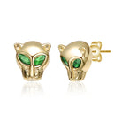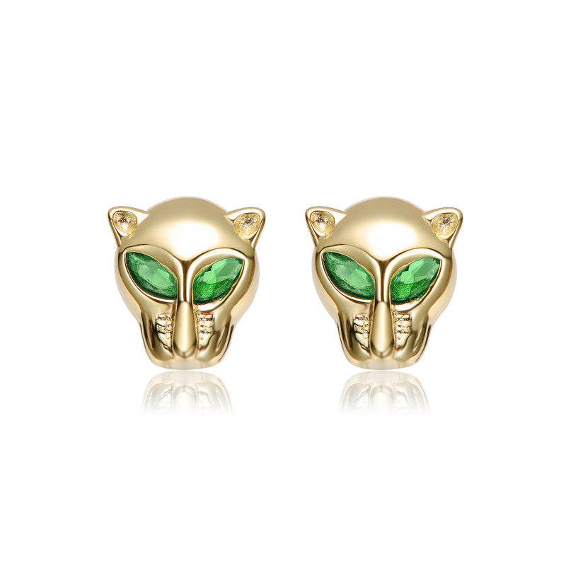 14K Gold Plated with Green Cubic Zirconia Eyes, Animal Face Stud Earrings