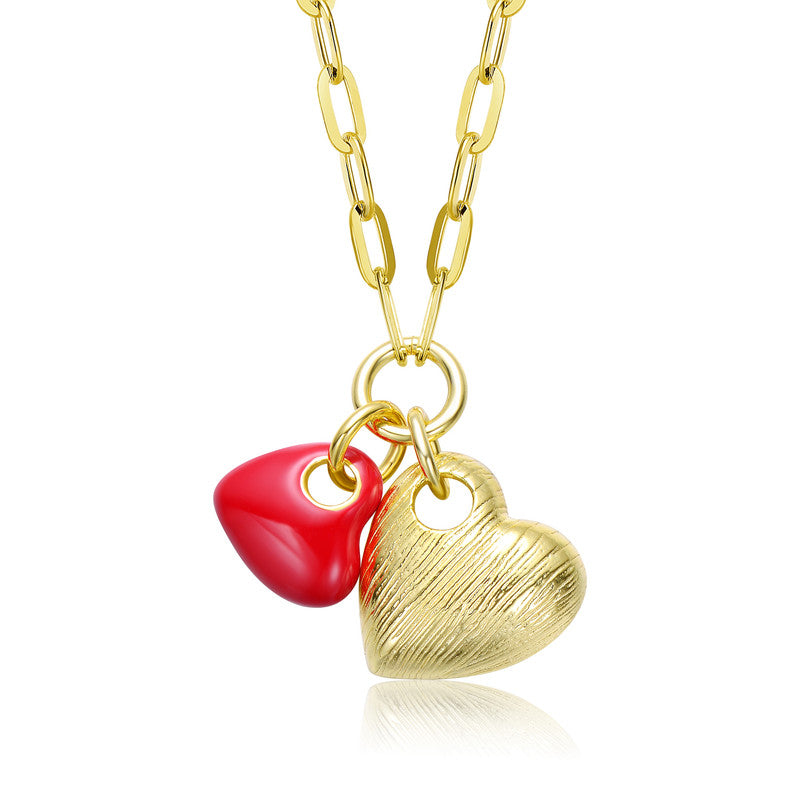 Elevate your style with this elegant 14K gold-plated necklace featuring a delicate link chain and two charming heart pendants. Designed for versatility, this necklace is available in two stunning variations—one with both hearts plated in radiant 14K gold plated, exuding timeless sophistication, and another featuring a striking contrast with one heart in rich red enamel and the other in luminous gold plating. Perfect for layering or wearing solo, this piece adds a romantic touch to any outfit, making it an ideal gift or everyday staple.