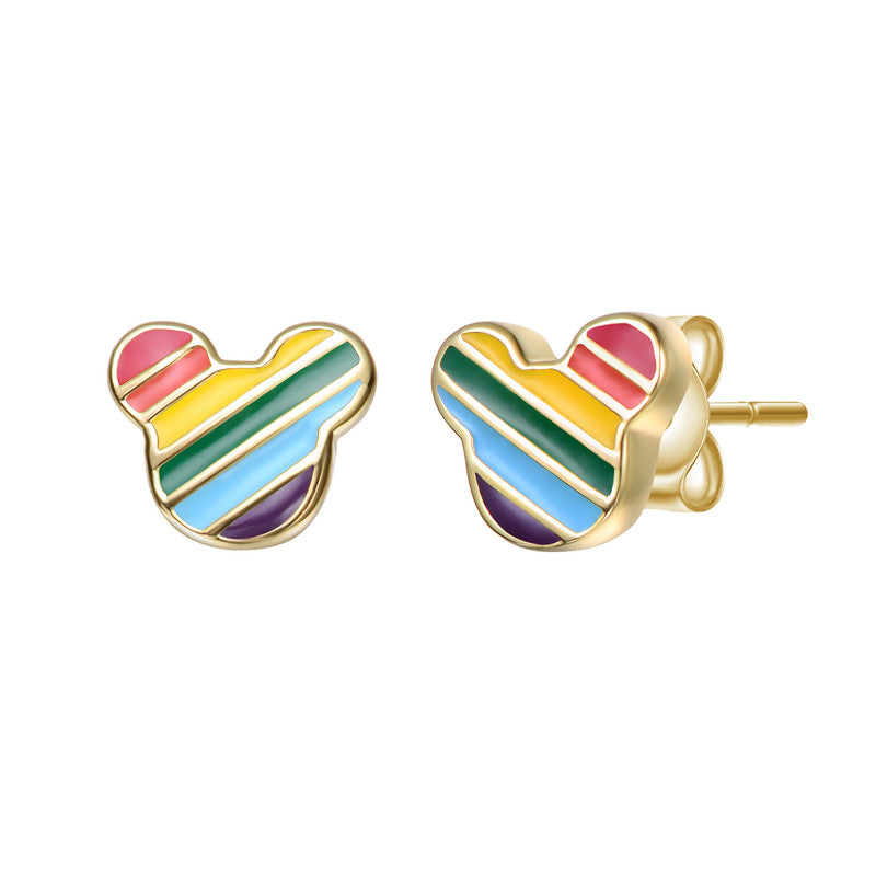 Add a touch of playful charm with these delightful Mickey Mouse stud earrings. Featuring vibrant stripes of red, orange, yellow, green, blue, and purple enamel set within a sleek 14K gold-tone outline, these earrings are a fun and colorful accessory for Disney fans of all ages. The classic Mickey silhouette makes them instantly recognizable and adds a whimsical touch to any look. These stud earrings are perfect for everyday wear or for adding a pop of personality to a special occasion. They fasten securely with post backs, ensuring comfortable and worry-free wear. A wonderful gift for yourself or a loved one who adores Disney magic and bright, cheerful style.