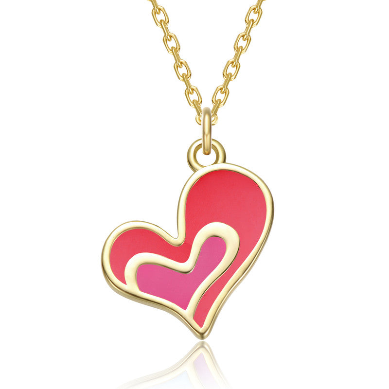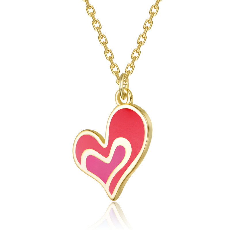 This stunning Pendant features a delicate 14K gold plating chain adorned with a heart-shaped pendant, beautifully crafted with pink and blue enamel accents. The asymmetrical heart design adds a contemporary touch, making it a unique and stylish accessory. The rich enamel colors contrast elegantly with the 14K gold plating outline, exuding sophistication and charm. Perfect for adding a pop of color to any outfit, this necklace is ideal for daily wear or special occasions.