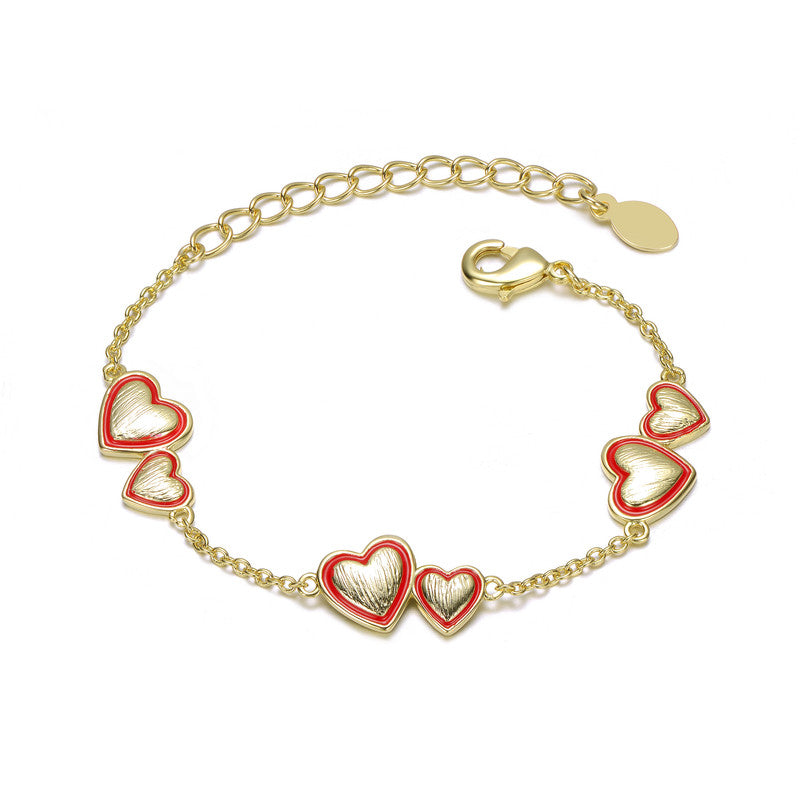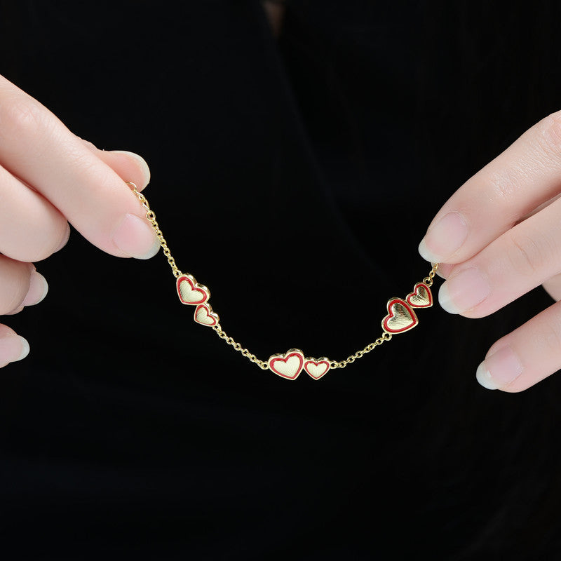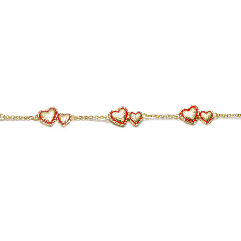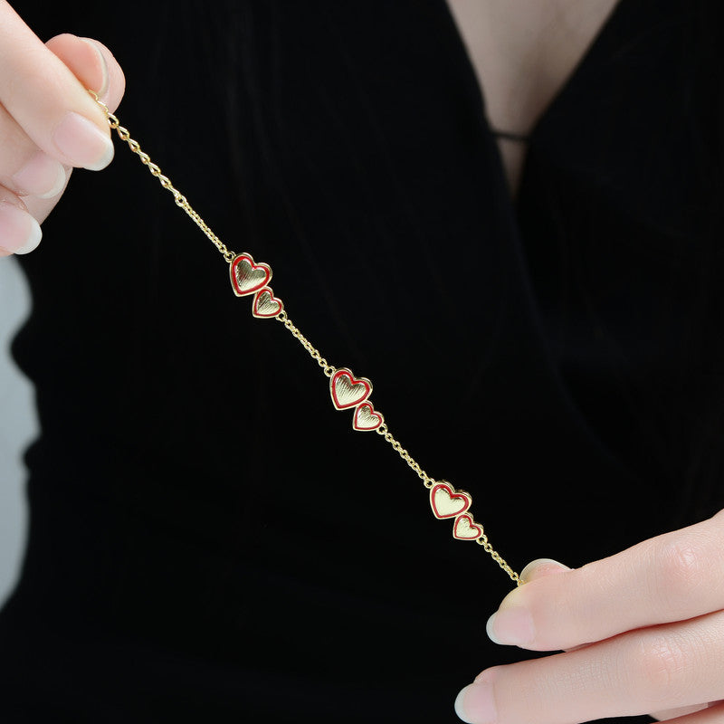 A romantic blend of gold and vibrant red, this 14K gold-plated bracelet features five heart-shaped charms adorned with striking red enamel. The chain link design adds elegance, while the adjustable extension ensures a perfect fit. The largest heart at the center draws attention, complemented by smaller hearts on either side. Finished with a secure lobster clasp, this piece is a timeless symbol of love and charm—ideal for everyday wear or special occasions.