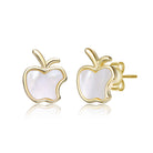 These are adorable stud earrings shaped like apples. They feature a pearlescent white inlay within a 14K gold plating outline, creating a sweet and charming look. Perfect for adding a touch of playful elegance to any outfit.