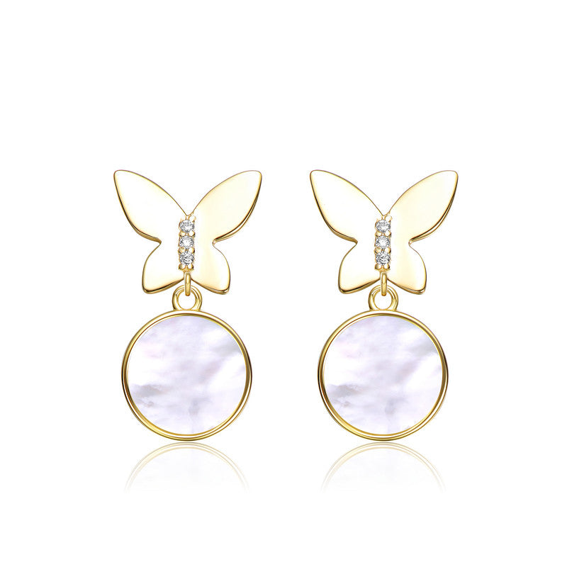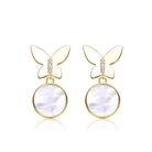 14K Gold Plated with White Mother Of Pearl Circle & Butterfly Drops Earrings
