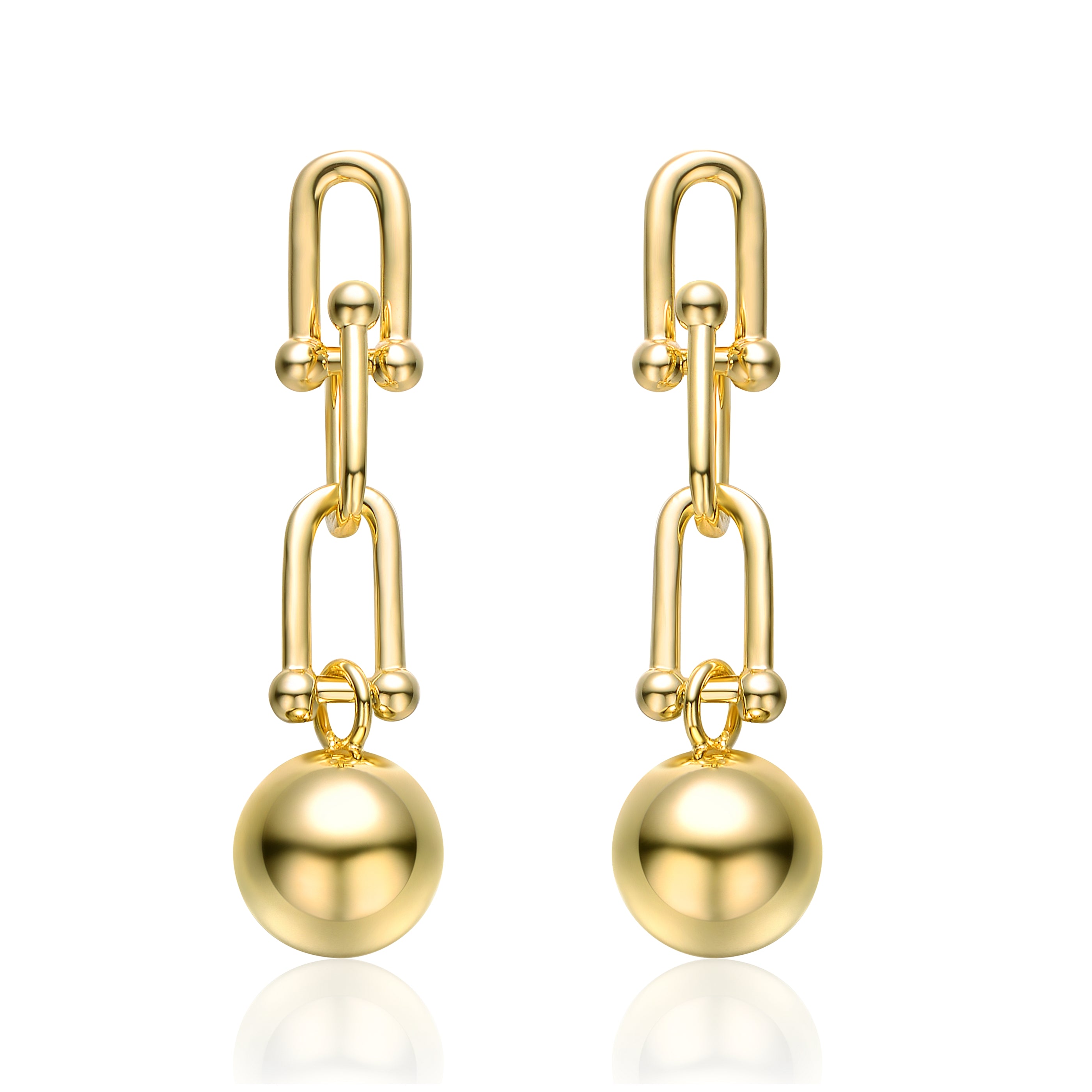 14k Yellow Gold Plated U-Shaped Link Chain Drop Earrings with Golden Ball