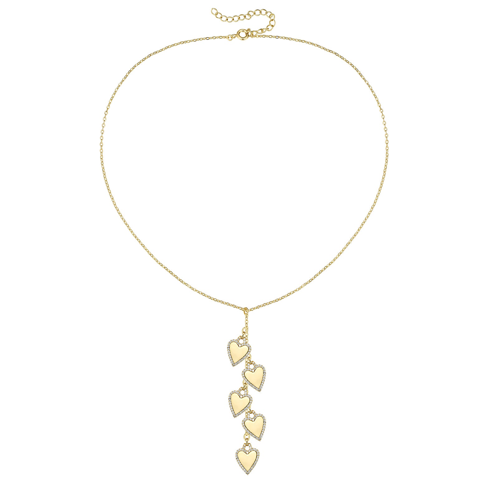 14k Yellow Gold Plated with Cubic Zirconia Heart Fringe Linear Dangle Chain Pendant Necklace. Oh, so charming! This brightly polished 14k yellow gold plated necklace features glittering round brilliant cut cubic zirconias pave-prong set on a single fringe of heart charms, giving it a contemporary yet sweet style for any time. A shiny cable chain suspends this decadent pendant design, secured with a spring clasp and extension chain for added length.