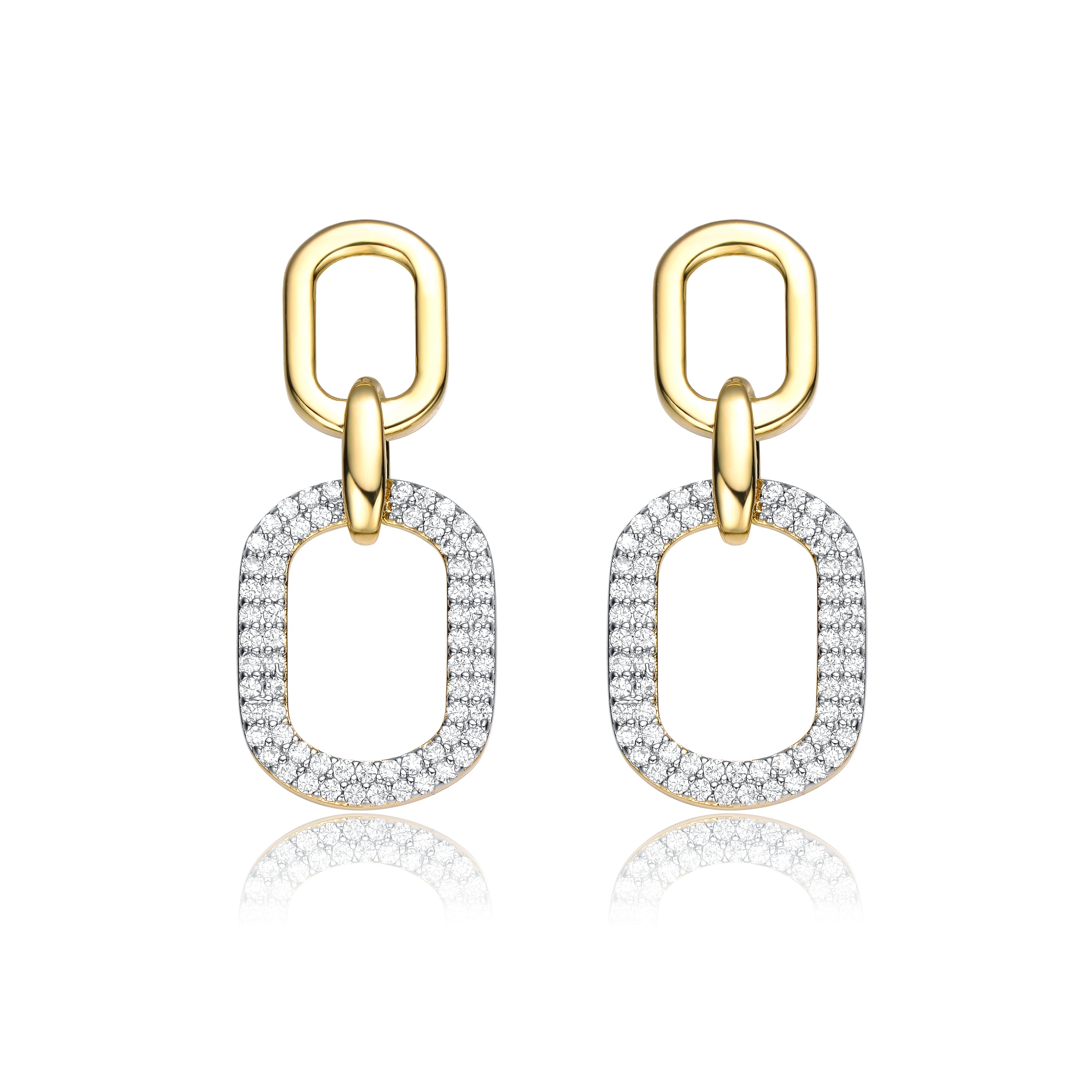 14k Yellow Gold Plated with Cubic Zirconia Pave Geometric Oval Chain Dangle Earrings. Make bold moves with these luxe 14k yellow gold plated dangle earrings, crafted in a high-shine finish and slinky style. Sparkling round brilliant cut cubic zirconia pave set on the bottom lends next-level glamor. Brightly polished oblong geometric oval links comprise this design for those who love effortless sophistication. Butterfly backs keep these statement-worthy dangle drop earrings in place.