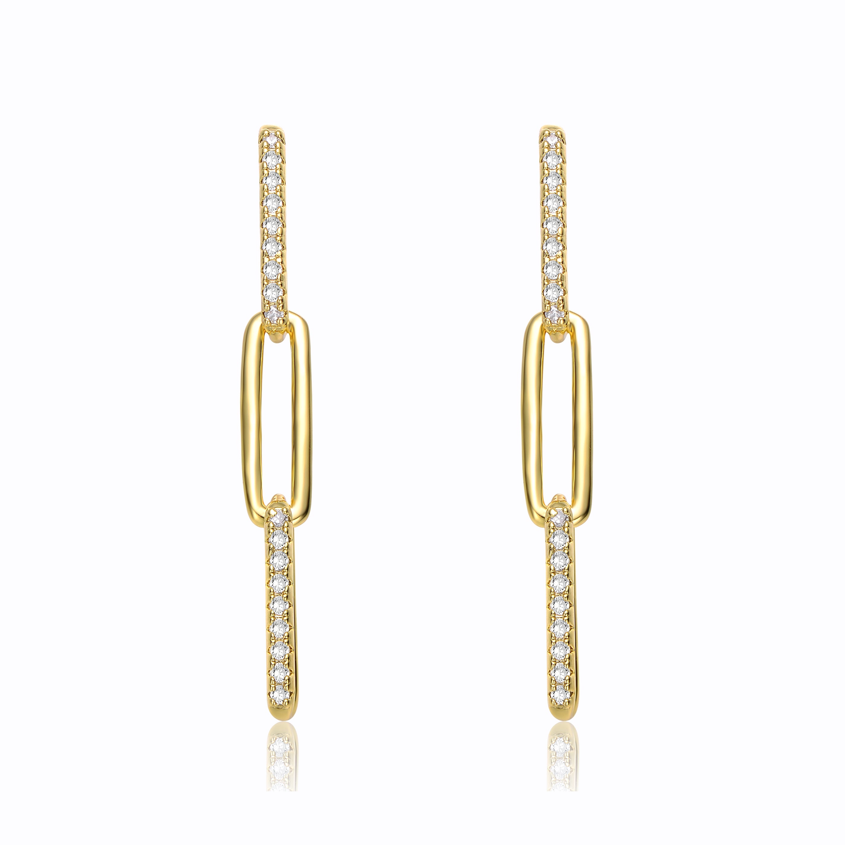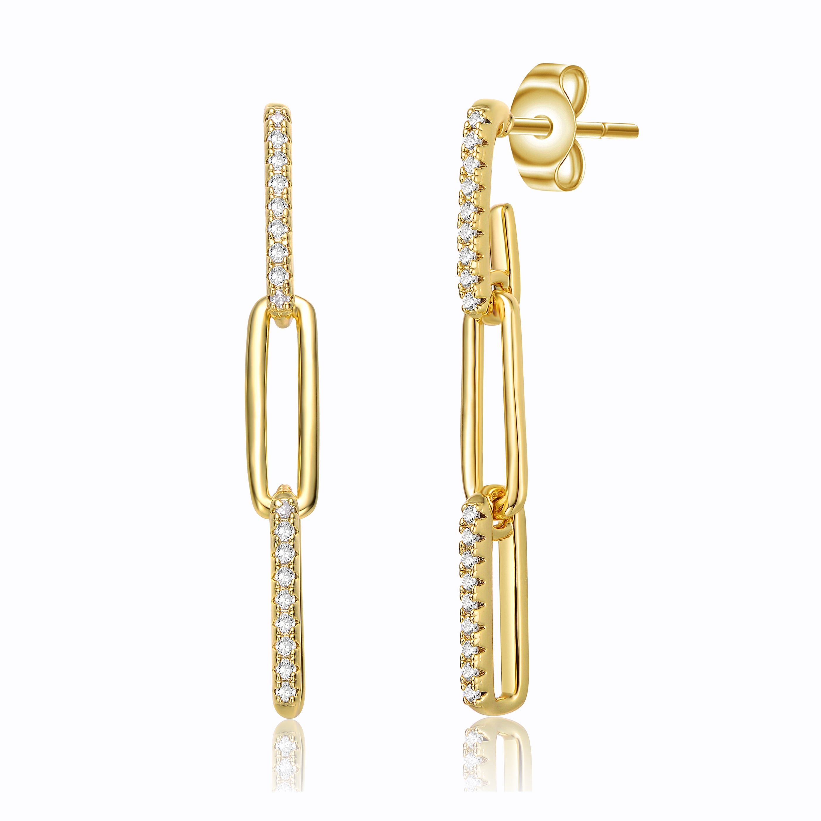 14k Yellow Gold Plated with Cubic Zirconia Triple Oblong Oval Cable Chain Drop Earrings. These brightly polished 14k yellow gold plated dangle earrings are all you need with their modern yet classic elegance. Glittering round brilliant cut cubic zirconia pave set on the top and bottom of each earring gives these linear drop earrings added glamor. Butterfly backs keep these drop chain earrings secure, making them an effortless way to upgrade any outfit for your lifestyle.