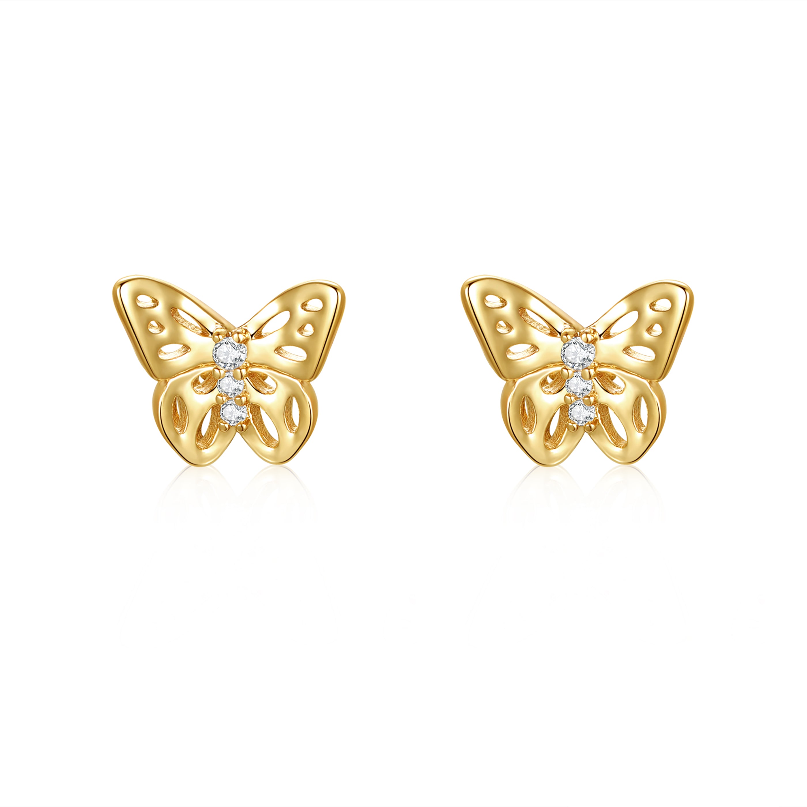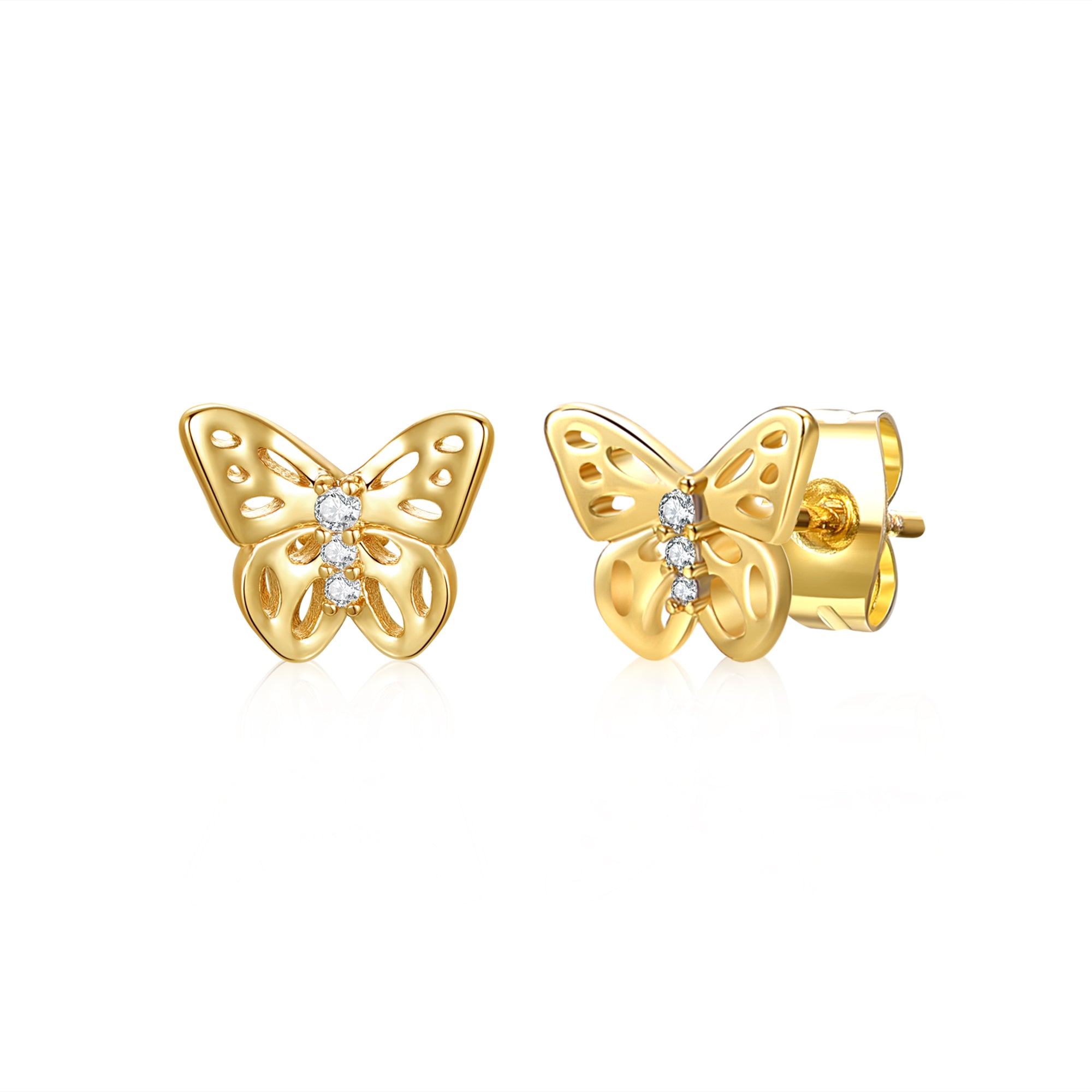 14k yellow gold plated with ruby cubic zirconia 3-stone filigree butterfly stud earrings. Add a source of joy and enchantment to your day with these super-cute 14k yellow gold plated stud earrings. A glittering trio of round brilliant cut diamond-like cubic zirconias prong set in the center of these whimsical butterflies upgrades them to another level of glam. Butterfly backs keep these ultra-shiny studs secure, perfect for wearing with other earrings in neighboring earring holes or solo. Also available in clear cubic zirconia.