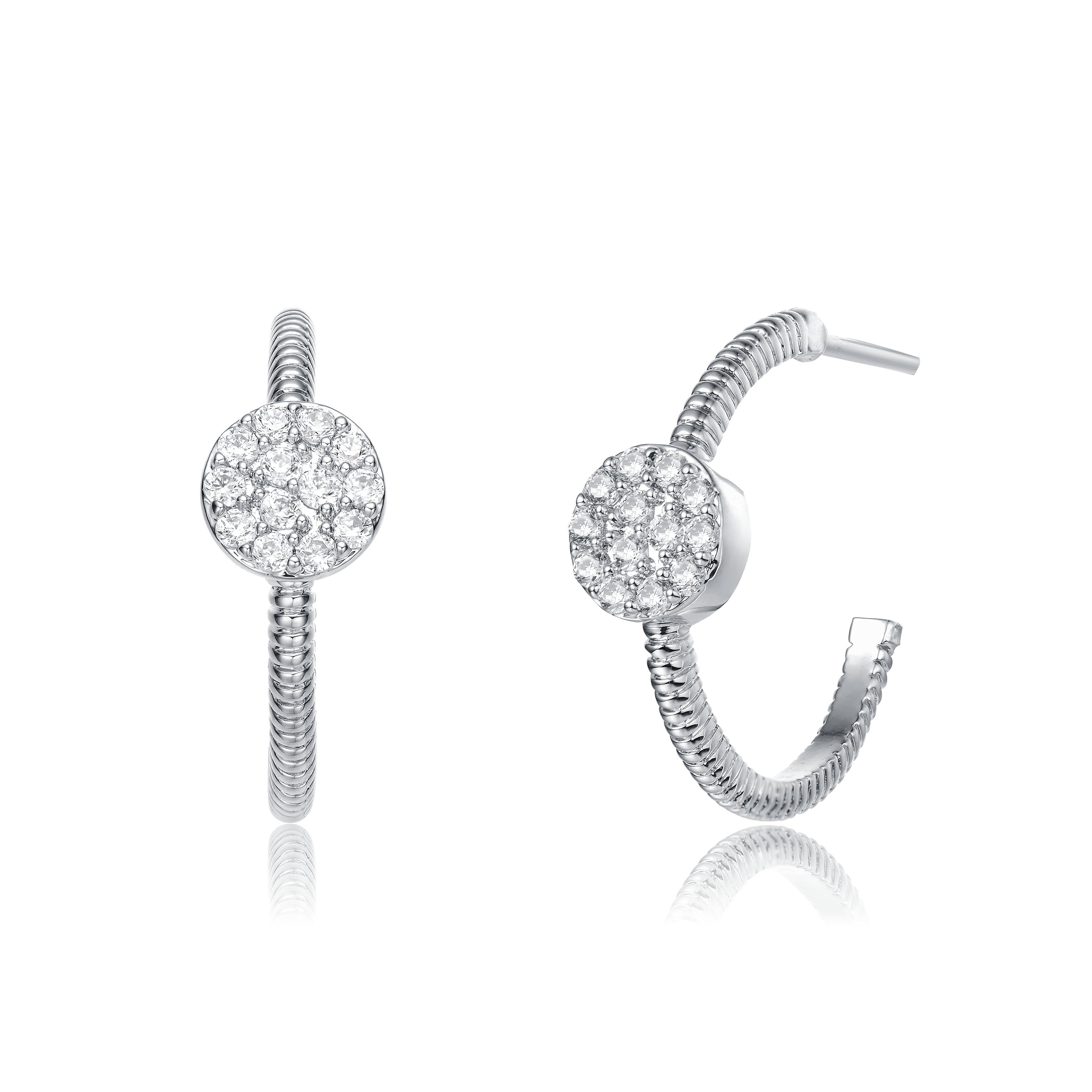 Elegant Rhodium Plated 20mm Open Hoop Earrings. This item's design features clear round Cubic Zirconia stones paved on the round metal frame. Crafted with Rhodium Plating and it secures with butterfly closure. This item makes a great gift as well.