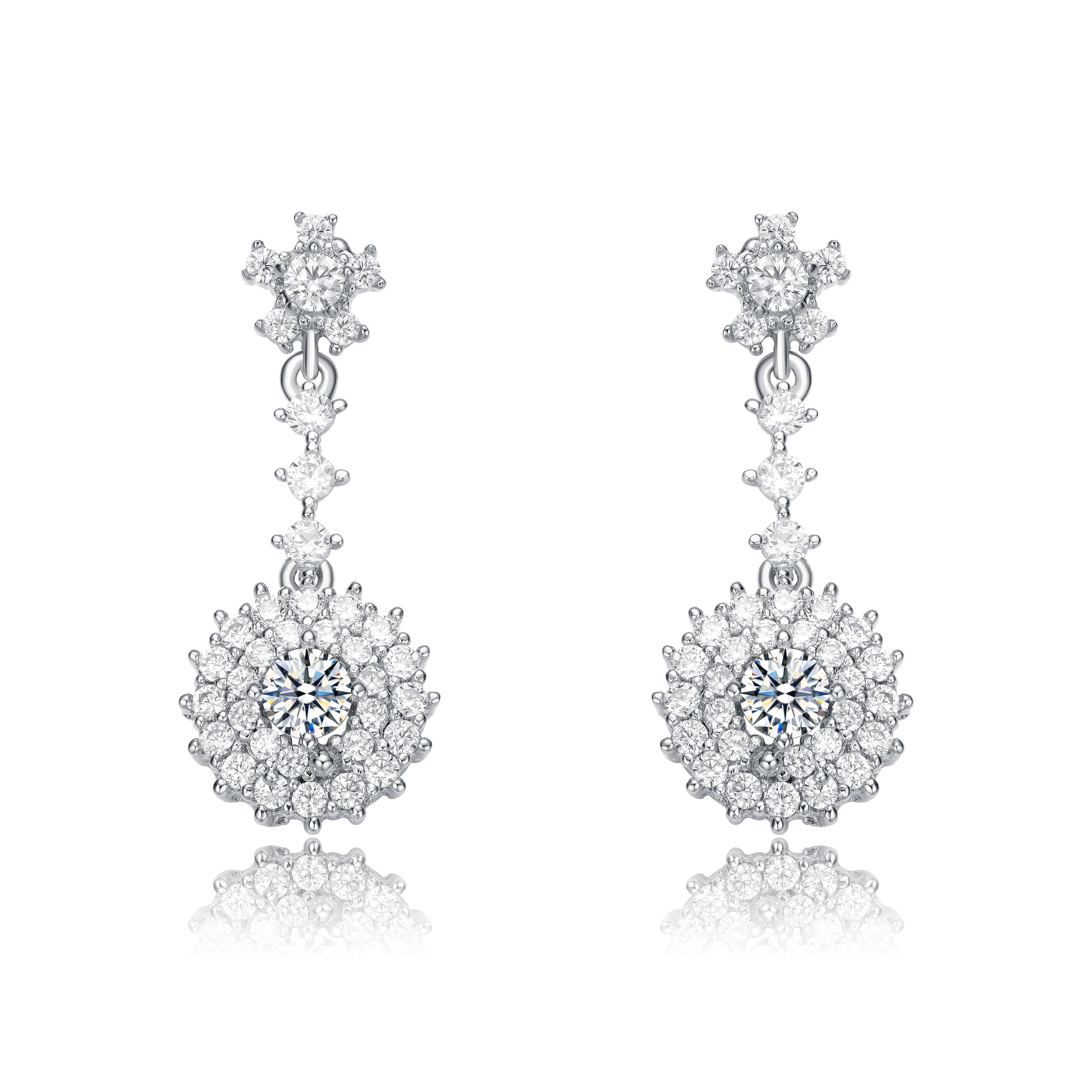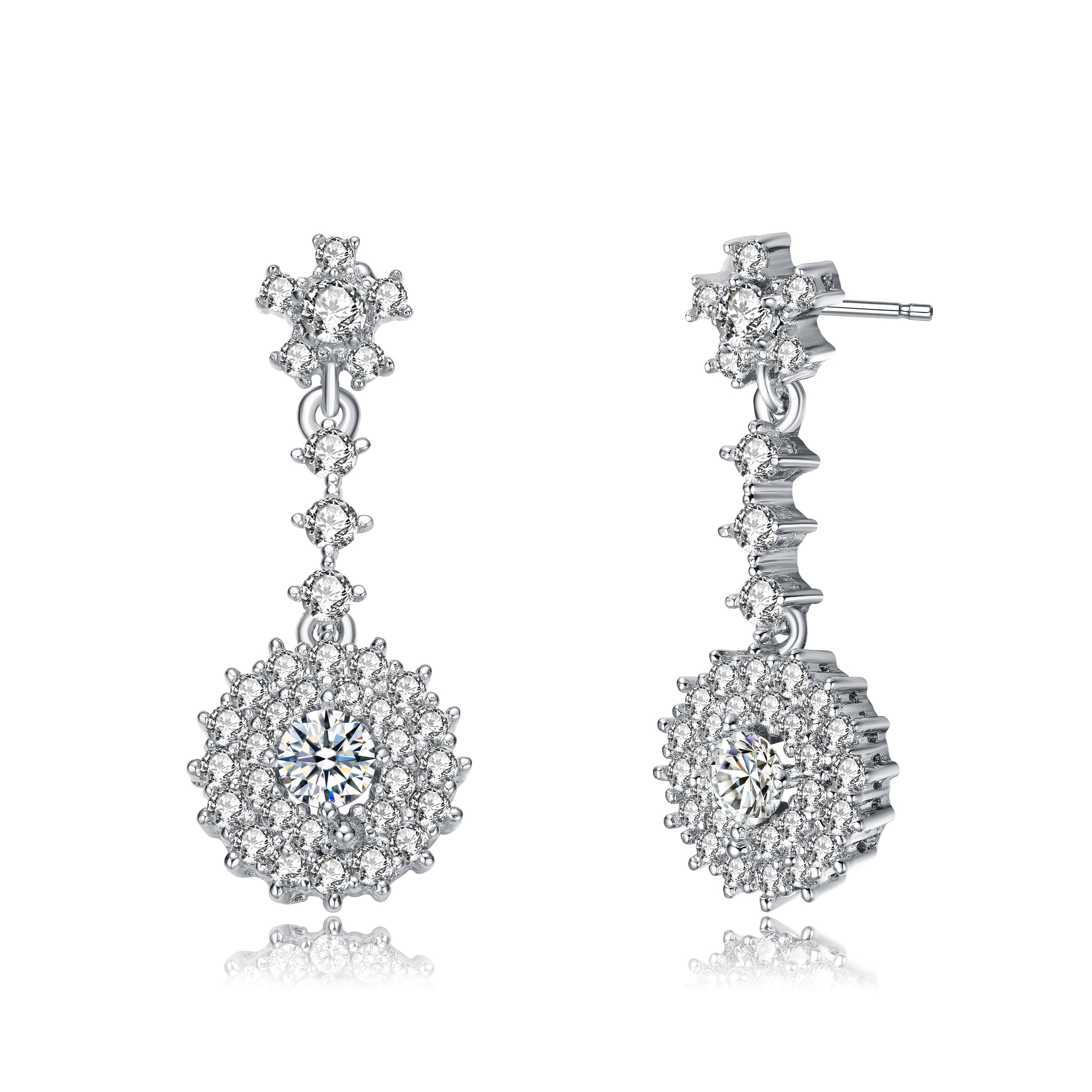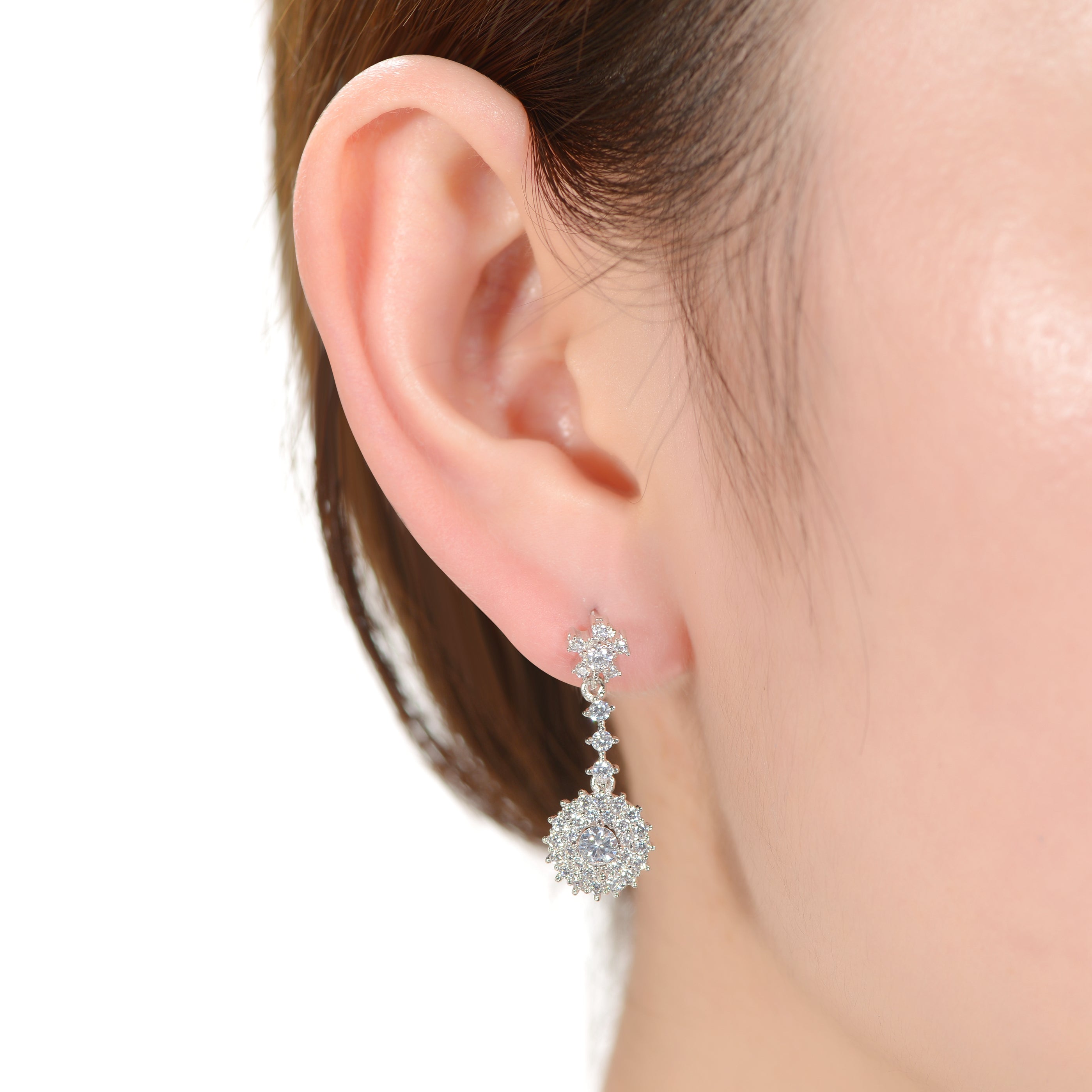 Show your adorable side when you wear these eleagant Drop Earrings. It is Rhodium plated . The round design is formed using clear round Cubic Zirconia as center surrounded with smaller stones on the base continuing on upper part made out of Cubic Zirconia that is artfully done to add elegance to any outfit. It is secured with a butterfly closure.
