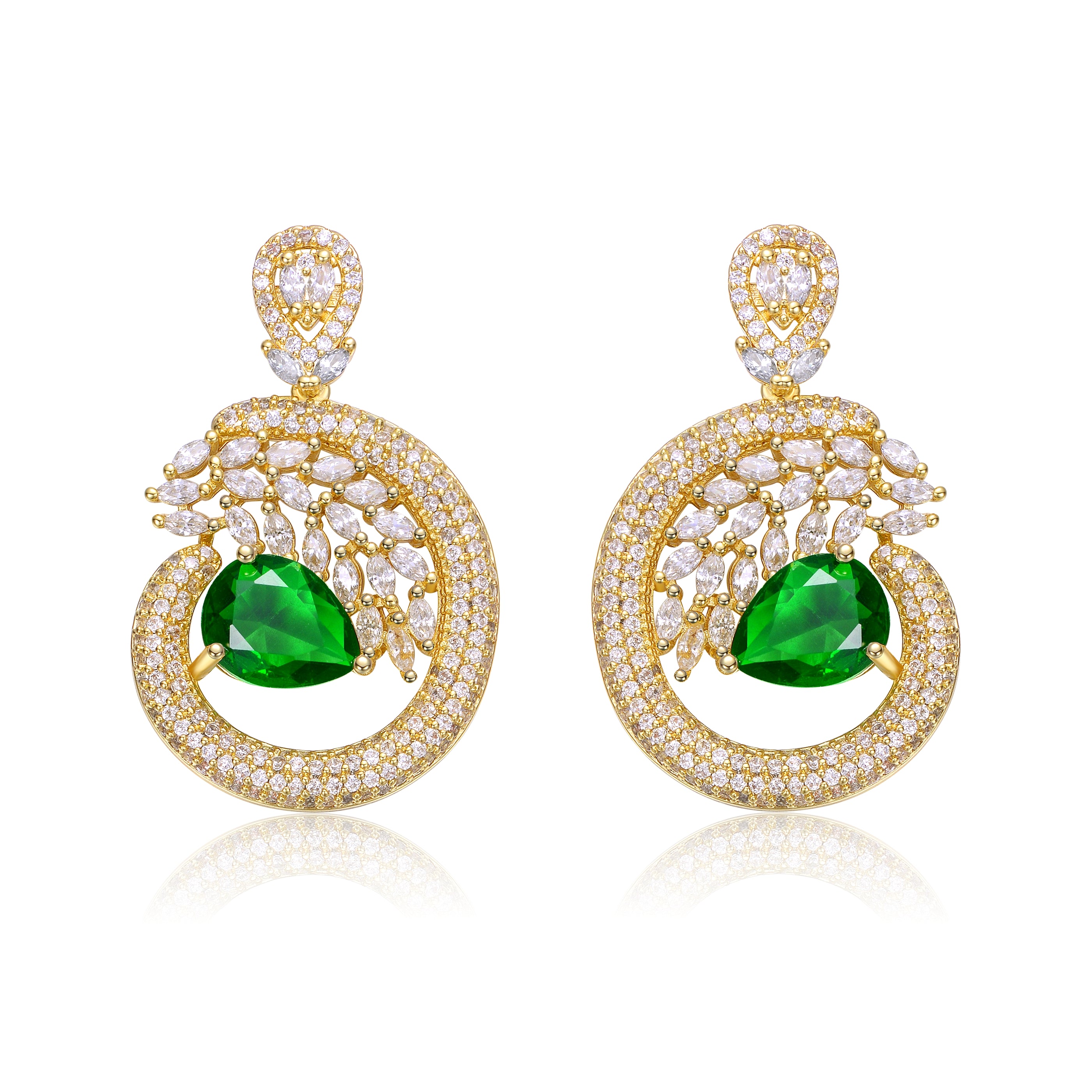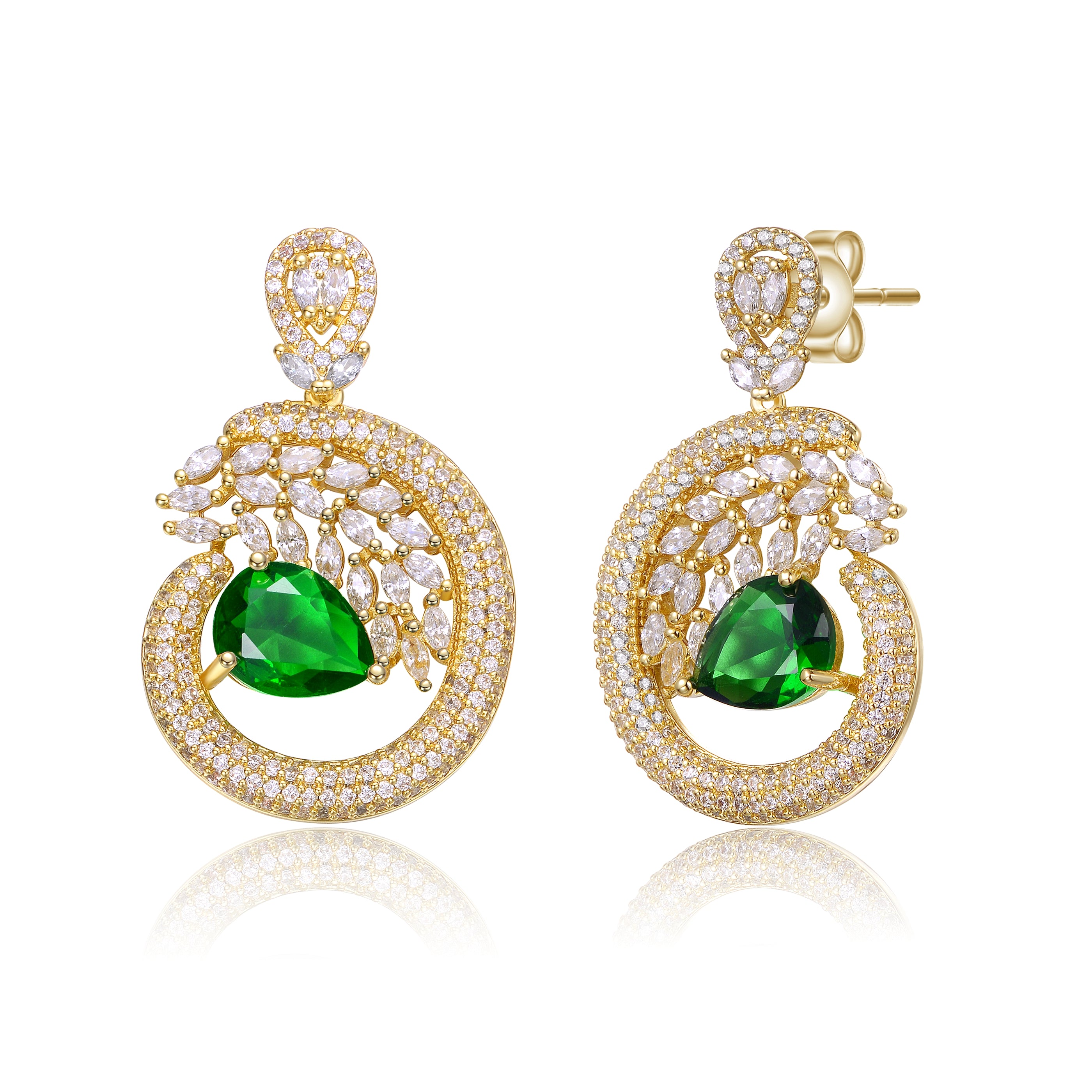 These exquisite earrings feature a captivating design with a central emerald stone that is beautifully faceted, capturing the light to reveal its deep green hue. The emerald is set in a unique gold-plated loop encrusted with sparkling clear cubic zirconia stones that mimic the brilliance of diamonds. The loop design creates an illusion of motion, as if the emerald is swinging within a shimmering halo. A smaller, matching cubic zirconia-encrusted loop attaches to the post backing, ensuring these earrings are both secure and stylish. Perfect for adding a touch of elegance to any outfit, these earrings are an ideal accessory for those who appreciate luxurious jewelry with a modern twist.