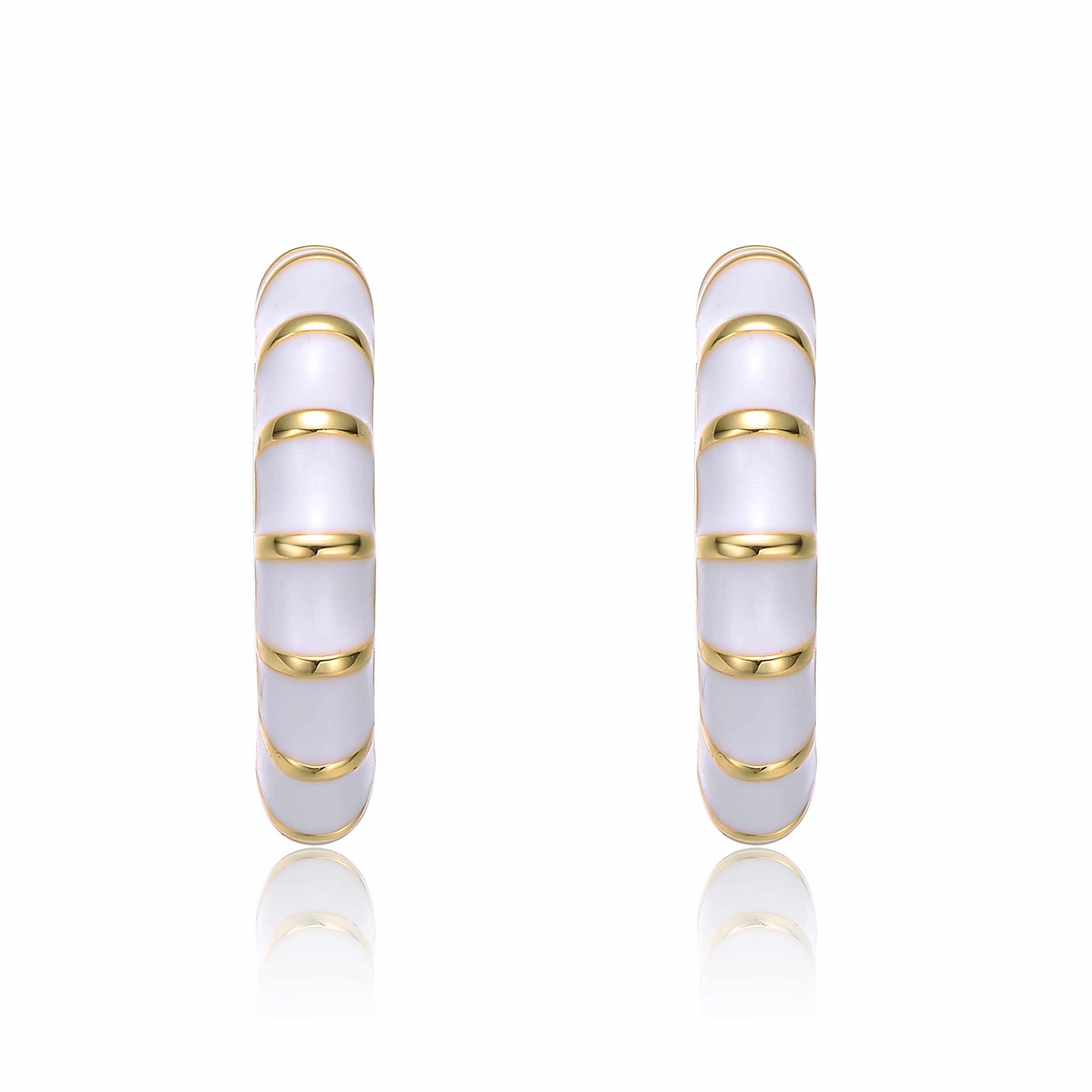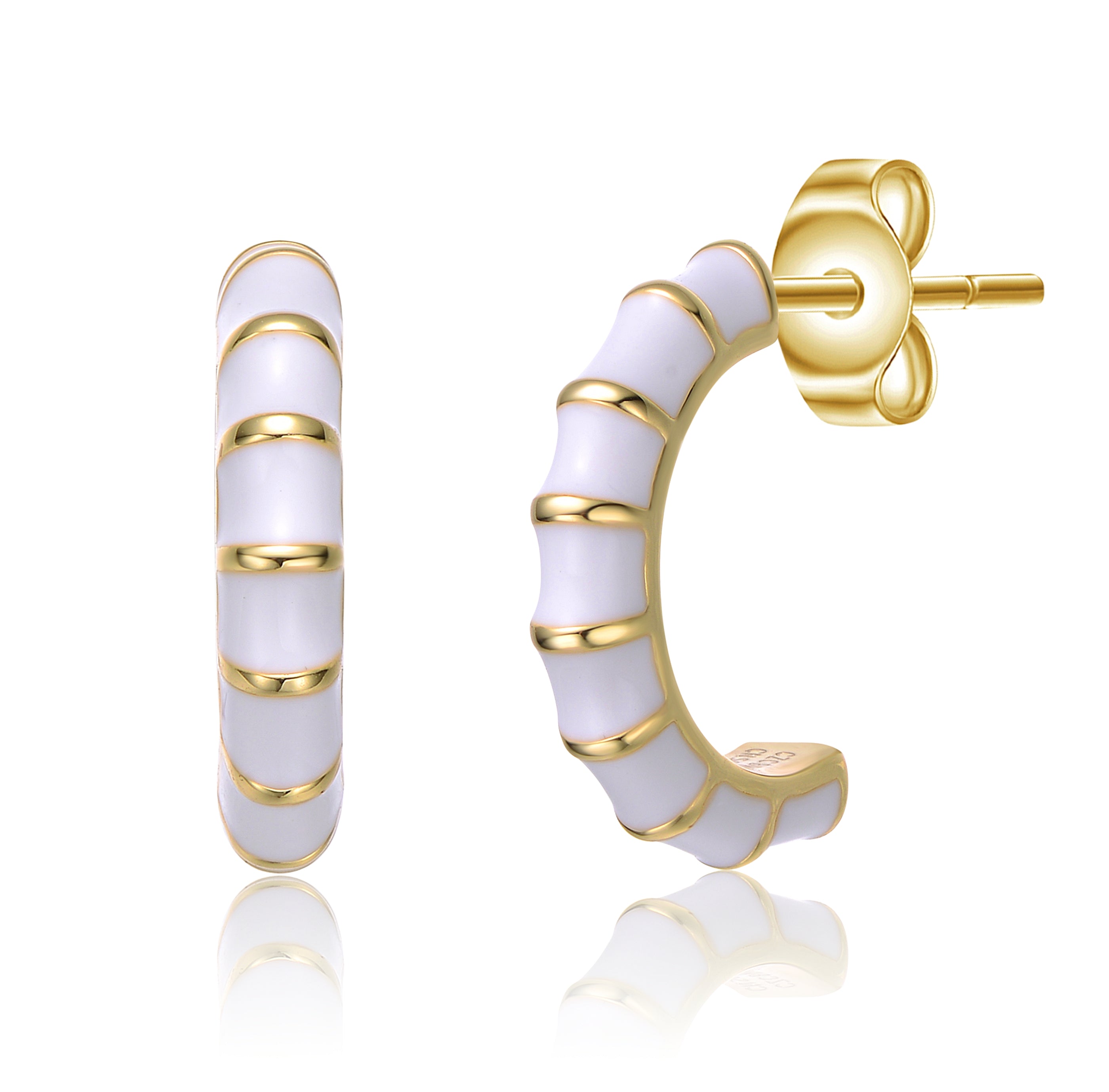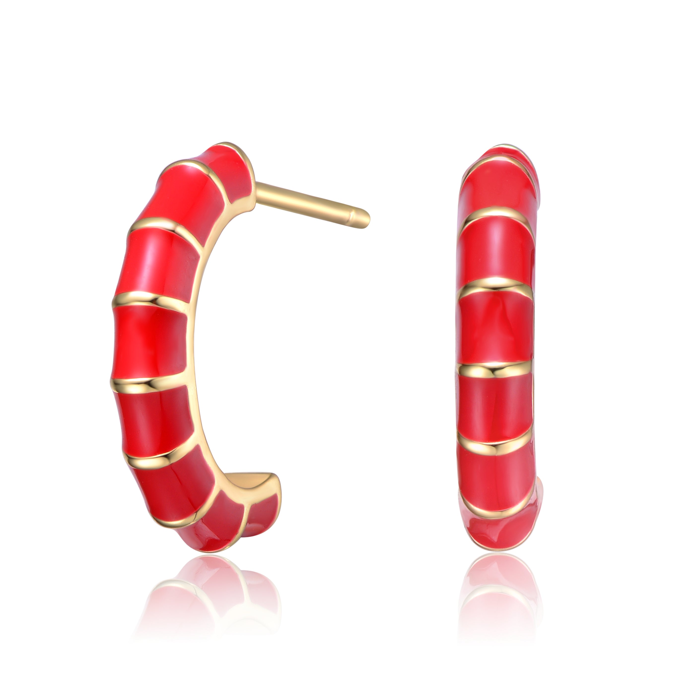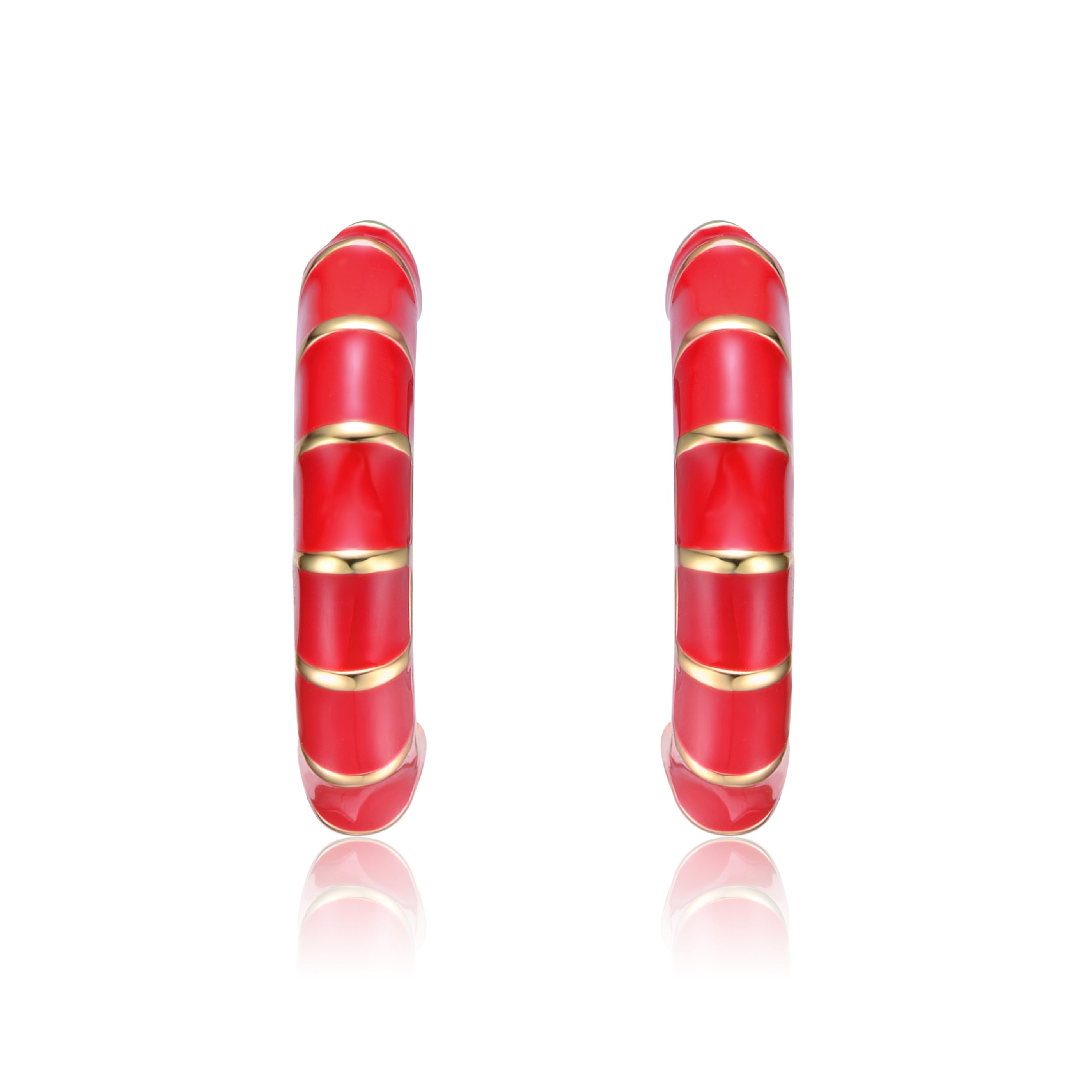 14k gold Plated Red Enamel Seashell Half C-Hoop Earrings. These unique 14k gold plated half-hoop/c-hoop earrings feature a dimensional tubular shape. Rich Red enamel on the front with ribbons of gold gives these unique hoops a seashell design, perfect for adding a fun-in-the-sun look to your day or night wardrobe. Pack these stylish earrings away on your next vacation, secured with butterfly backs for pierced ears. These earrings are also available with white enamel.