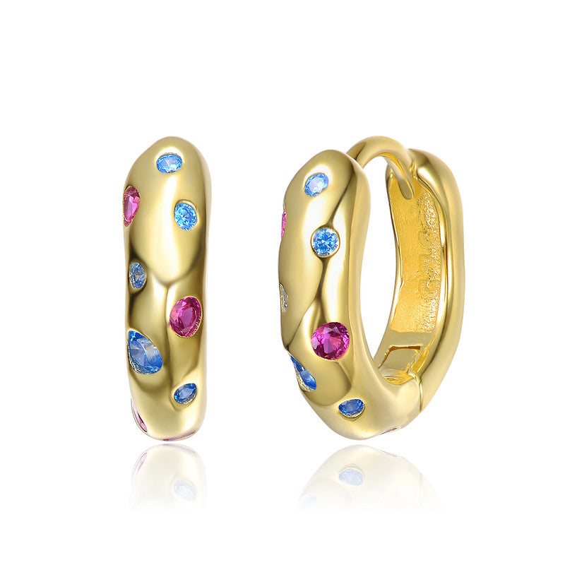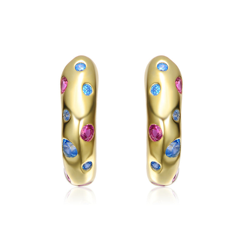 Add a touch of luxury with our 14K Gold Plated Colored Cubic Zirconia Wide Hoop Earrings. These captivating hoops feature a polished gold surface adorned with vibrant blue and pink cubic zirconia stones, ensuring they stand out. With a secure clasp, they're comfortable for all-day wear. Perfect for any outfit, these earrings combine elegance and sparkle to elevate your style.