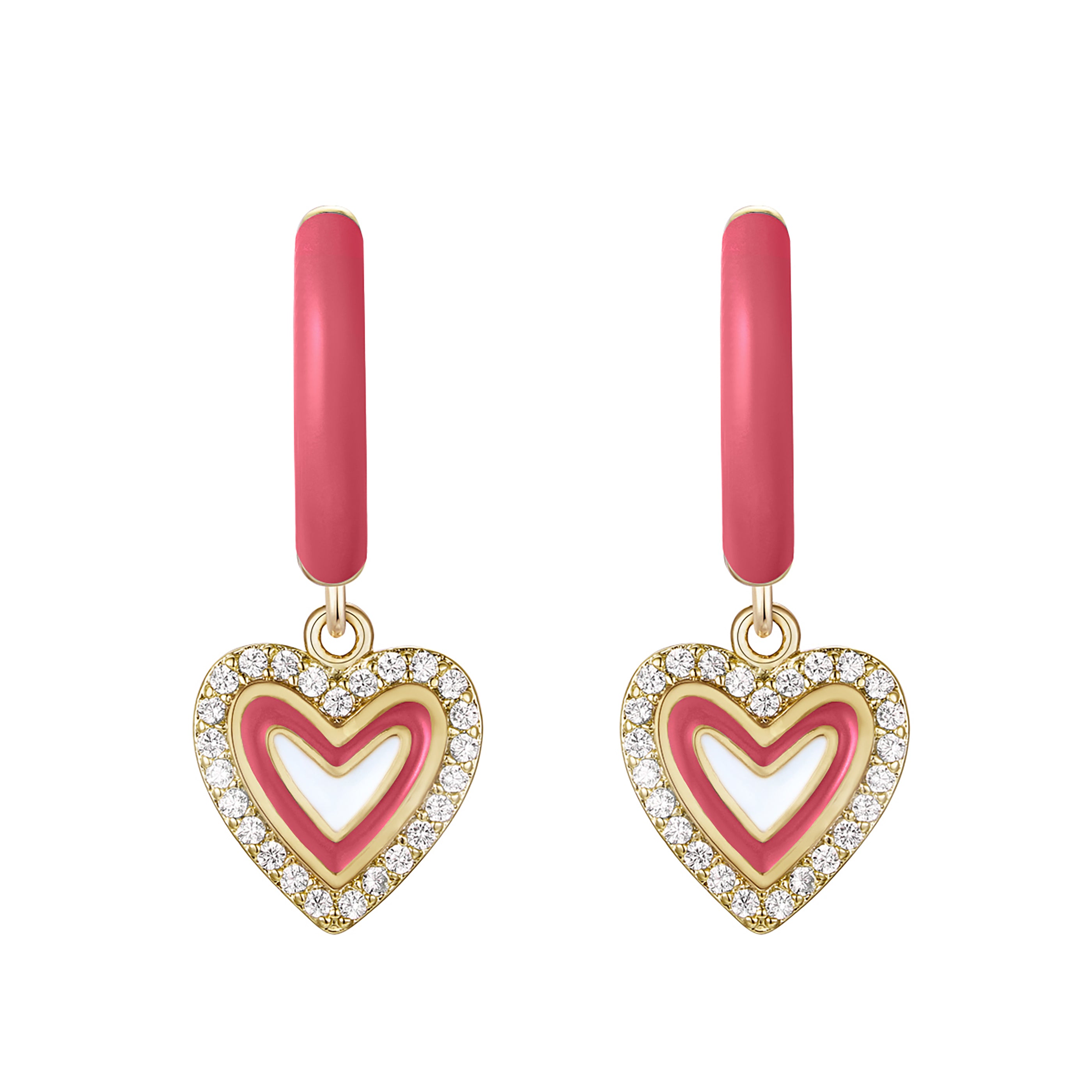 Kids 14k Gold Plated with Cubic Zirconia & Magenta-Red Enamel Halo Heart Dangle Charm Hoop Earrings. These cute earrings feature magenta-red enamel-covered heart hoops. Sparkling round brilliant cut cubic zirconias frame the heart charms in vintage-style halos. Hinged backs keep these mini hoops secure, all crafted from 14k gold plating.