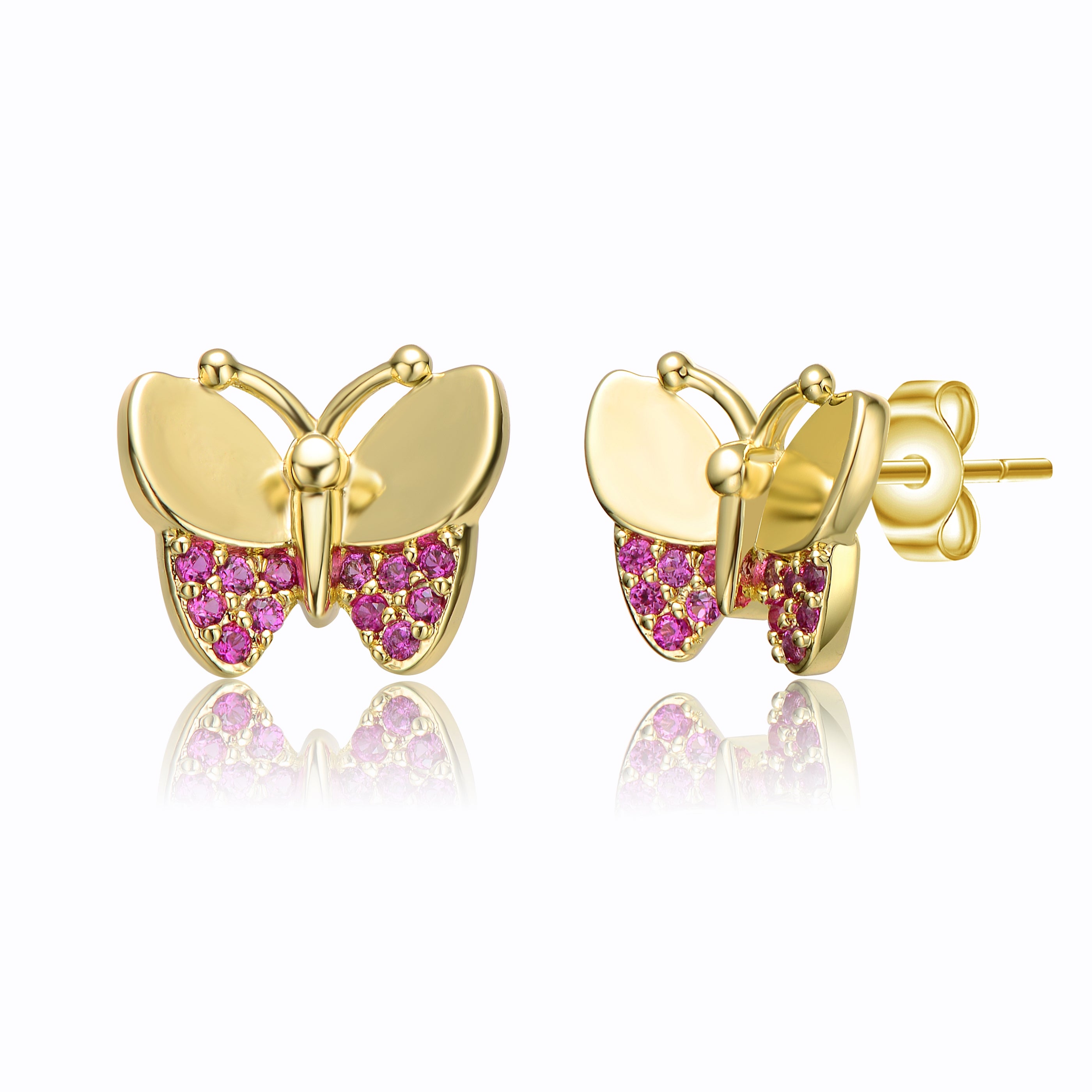 Add a source of nature's enchantment to your Kid's day with these super-sweet butterfly studs. Sparkling round brilliant cut rubycubic zirconias dust the bottom of each shiny wing. Screw backs keep these jubilant 14k gold plated earrings secure.